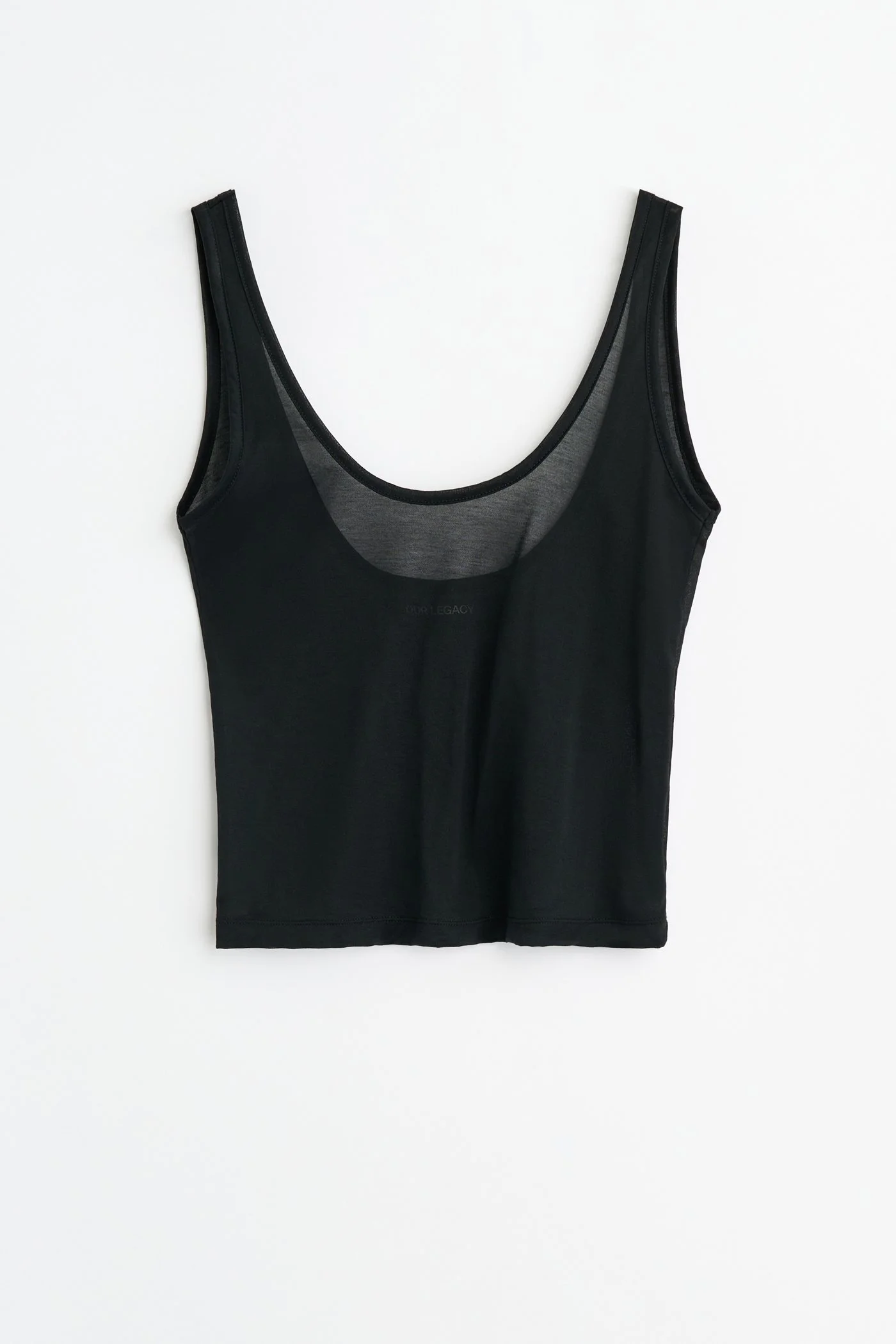Details · Japanese fabric · 70% Cotton 30% Nylon · Low round neckline · Tighter fit · Armholes and neckline bound with ribbing · Can be styled on its own or as a layer · W4256BB Description Our Blade Tank in Black Stocking Jersey. Produced in a Japanese cotton and nylon blend fabric, the Blade Tank draws inspiration from the SS25 Bathe tank with a similar low round neckline. The tank has a tight fit and slightly longer length, with armholes and neckline bound with ribbing. This versatile top can be styled on its own or as a layer.