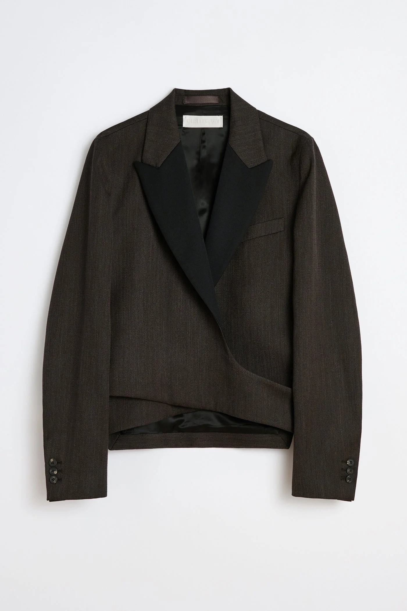 Details · Italian fabric · 100% Virgin Wool · Horn buttons · Peak lapel · Fake chest pocket · Fully lined · Wrap around closure · Button cuffs · W4250WH Description Our Wrap Blazer in Havana Brown Chain Wool. Produced in an Italian virgin wool fabric, the women's Wrap Blazer has a straight silhouette with traditional tailoring elements and features a wrap around closure that can be styled tied at the waist or left unwrapped for a more casual look, contrast shiny peak lapels, a fake chest pocket, sleeve button vents, horn buttons, and a longer back with side split inspired by tailcoat jackets. The blazer is fully lined.