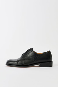 Details · Italian bull leather · Norwegian welted construction · Asymmetric cutlines with patched leather panels · Contrasting shine details · Leather outsole · Stacked heel · Leather lined · Derby style · A2267PM Description Our Patched Parade in Malleable Black Bull Hide. Produced in Italian bull leather, this derby style reworks our Uniform Parade with asymmetric cutlines and patched leather panels in contrasting shine. The shoe is Norwegian welted and finished with a leather outsole, a stacked heel and a smooth leather lining. This product is crafted from carefully sourced leather. As a natural material, leather carries subtle traces of the animal's life. These natural imperfections bring a unique character to each product, expressing an original and authentic look. The product shall be shaped by its wearer and naturally distress over time to complete the design process.