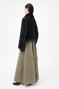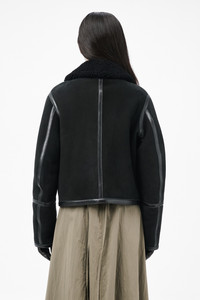 Details · Turkish shearling · 100% Lamb Leather · Brushed nubuck finish · Shearling reverse side · Shearling collar · Leather collar strap detail · Jet side pockets · Two way Lampo zip · Leather taped seams · Vented inner cuff · Boxy, slightly cropped fit · W4249PB Description Our Pilot Jacket in Black Shearling. Produced in a Turkish nubuck shearling leather, the womens Pilot Jacket has a boxy, slightly cropped fit and features a shearling collar with a leather strap, jet side pockets, a two way Lampo zip, leather taped seams and vented inner cuffs. This product is crafted from carefully sourced leather. As a natural material, leather carries subtle traces of the animal's life. These natural imperfections bring a unique character to each product, expressing an original and authentic look. The product shall be shaped by its wearer and naturally distress over time to complete the design process.