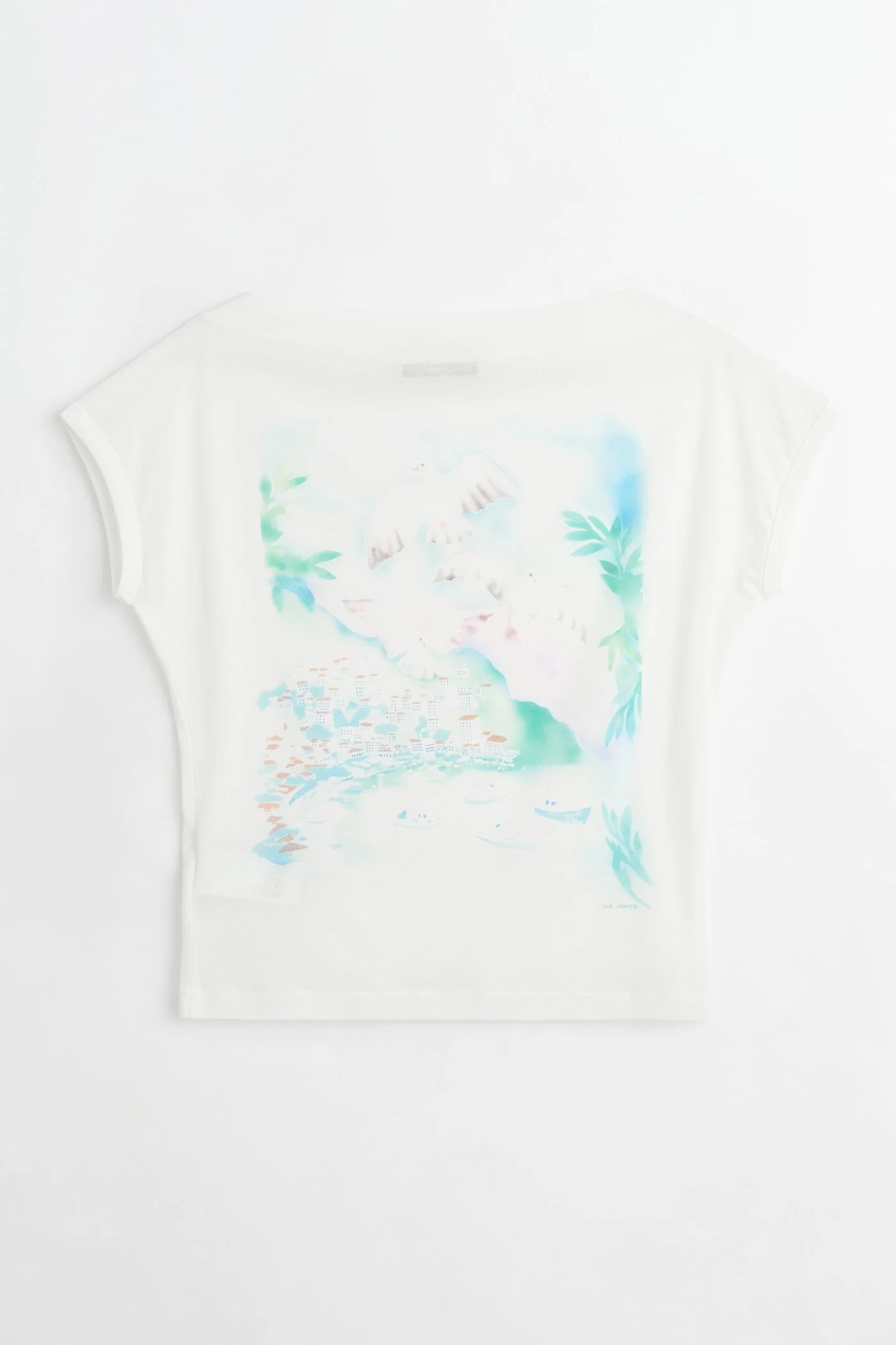 Details · Italian jersey · 100% Organic Cotton · Sea View back print · Boat neck · Bat wing sleeves · Colaretto ribbed sleeve hems · Relaxed, regular fit · W2256SS Description Our Sailor T-Shirt in Sea View Print Para Cotton. Produced in an Italian cotton jersey with our Sea View back print, the women's Sailor T-Shirt has a relaxed, regular fit and features a boat neck, bat wing sleeves and colaretto ribbed sleeve hems.