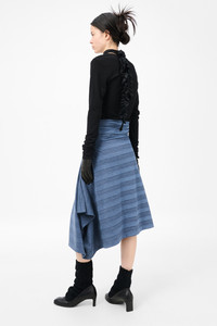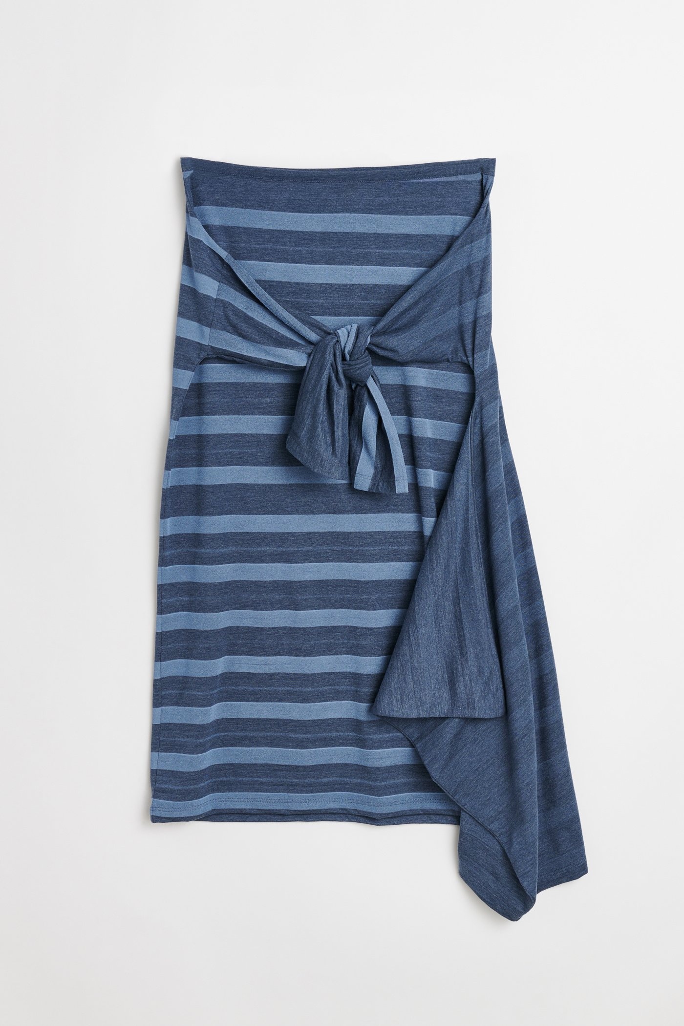 Details · Portuguese jersey · 50% Cotton 50% Polyester · Faded stripe print · Sleeve waist ties · Bound waistline · Asymmetrical hem · Can also be styled as a dress · W2256S7P Description Our Sash Skirt in 70S Jersey Wave Plisse. Produced in a Portuguese cotton and polyester blend fabric with a faded stripe print, the women's Sash Skirt has relaxed asymmetrical silhouette and features a bound waist and sleeve ties around the hip. The Sash Skirt can also be styled as an off the shoulder dress.