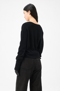 Details · Italian fabric · 100% Merino Wool · Deep neckline · Saddle sleeves · Elongated sleeves · Ribbed cuffs and hem · W4253SBC Description Our Sharp V-Neck in Black Cherub Wool. Produced in Italian merino wool yarn, the women's Sharp V-Neck has a flattering and sleek fit that sits close to the waist with a shorter length and features a deep neckline, saddle sleeves with elongated cut, and ribbed cuffs and hem. This garment is manufactured using a carefully sourced yarn. The natural characteristics of the yarn, combined with the construction of the knit allows the garment to expand when worn. The garment shall be shaped by its wearer and naturally distress over time to finish the design process. To help keep the integrity of the garment please store the garment folded.