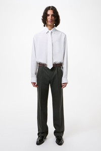 Details · Italian fabric · 80% Polyester 20% Viscose · Pinstripe herringbone · Low rise · Hidden closure · Pre-constructed waistband · Slight bootcut · Two side pockets · Two back pockets · Corozo buttons · YKK Zip fly · M2264SSPW Description Our Slack Trouser in Shark Pinstripe Herringbone. Produced in an Italian polyester and viscose suiting fabric with a refined herringbone weave and a subtle stripe design, combining a distinctive V-shaped pattern that adds texture. The Slack Trouser has a low rise with a slight bootcut and features a hidden closure, a pre-constructed waistband, a YKK zip fly, corozo buttons, two side pockets and two back pockets.