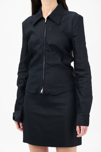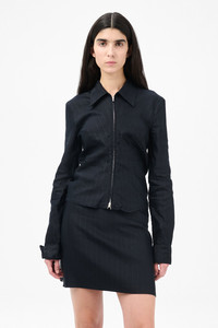 Details · Italian fabric · 48% Viscose 48% Linen 3% Elastane 1% Polyester · Lampo two way zip · Darted for shape · Button cuffs · No side seams · Curved hem · Regular, slim fit · W4252SN Description Our Slim Zip Shirt in Night Covert Flex Pinstripe. Produced in Italian fabric with a viscose, linen, elastane and polyester blend, the women's Slim Zip Shirt has a regular, slim fit and features a Lampo two-way zip, darted construction for shape, button cuffs, no side seams and a curved hem.