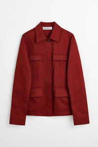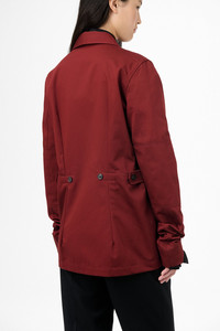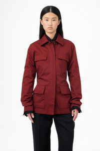 Details · Italian fabric · 100% Cotton · Half moon collar stand · Snap chest pockets · Patched elbows · Hidden placket construction · Side tabs at waist level · Fold up sleeve cuffs · W4252SPR Description Our Split Jacket in Profound Red Megatwist Twill. Produced in Italian cotton fabric, the women's Split Jacket is a hybrid style that brings together shirt elements with workwear details. Features include a hidden placket construction, half moon collar stand, snap chest pockets with flaps, patched elbows, fold up sleeve cuffs, and adjustable side tabs at waist level that can be attached towards the back to cinch the silhouette for a more tailored fit.