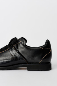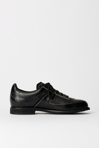 Details · Italian leather · Natural edges · Rounded toe · Vibram sole · Contrast suede detail · Metal Our Legacy rivet · A4247TBS Description Our Ten Pin Shoe in Black Strike Leather. Produced in an Italian leather with natural edges, the Ten Pin shoe is a relaxed formal shoe hybrid that features a Vibram sole, a contrast suede detail and a metal Our Legacy rivet.