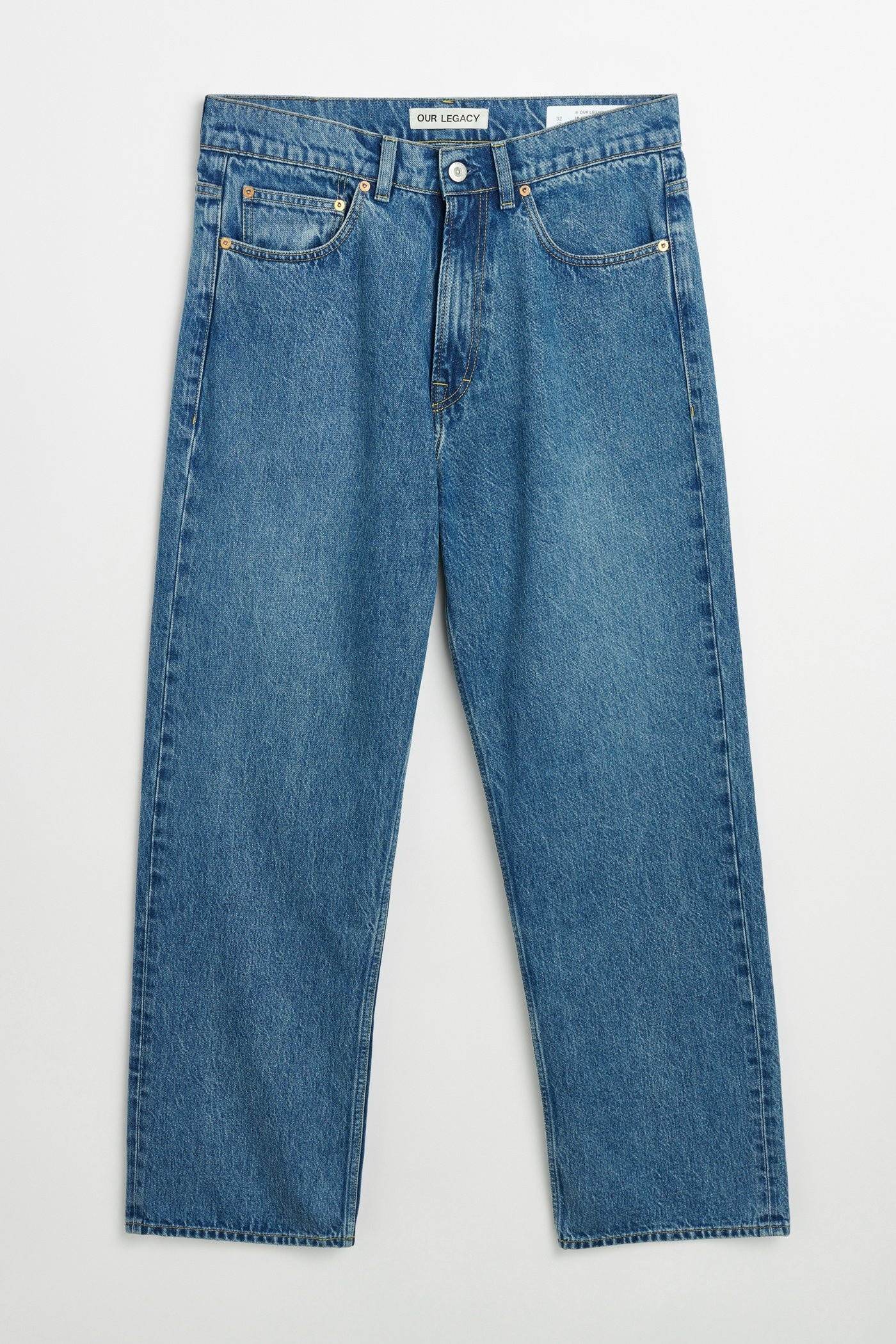 Details · Italian denim · 100% Cotton · Vintage washed · Relaxed fit · Wide straight leg · YKK zip fly · Metal rivets · OUR LEGACY embossed patch · Five pockets · Reinforced back pockets · M4225TBT Description Our Third Cut in Blue Tech Wash Denim. Produced in a vintage washed Italian denim, the mens Third Cut jeans have a relaxed, wide legged fit and feature a YKK zip fly, metal rivets and reinforced back pockets. This garment is manufactured from carefully sourced denim fabric. Each garment is unique and has been finished with a special washing process to achieve the desired vintage effect. The garment shall be shaped by its wearer and naturally distress over time to finish the design process.