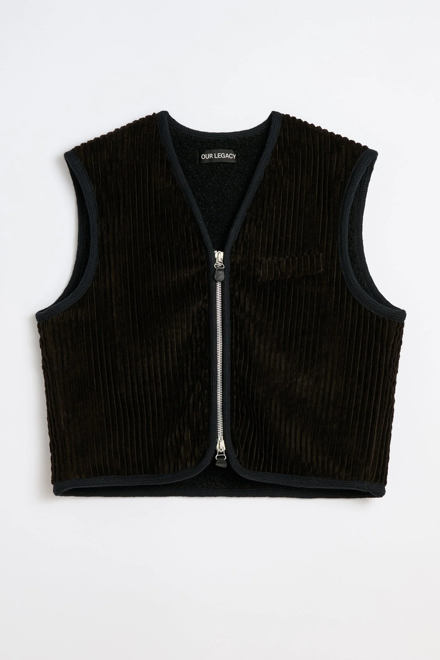 Details · Italian fabric · 100% Cotton · Heavy corduroy · Faux shearling lining · Two-way Lampo zip · Sleeveless · Single welt breast pocket · Boxy, cropped fit · M4251TP Description Our Top Vest in Profound Brown Mammoth Cord. Produced in Italian heavy corduroy fabric, the men's Top Vest has a boxy, cropped fit and features faux shearling lining, a two-way Lampo zip, a single welt breast pocket and a sleeveless construction.