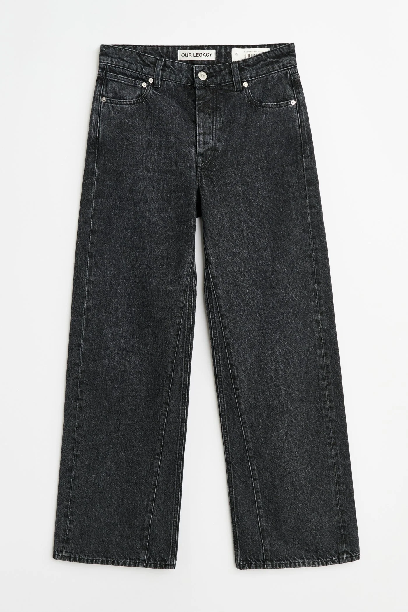 Details · Italian denim · 100% Cotton · Five pockets · Button fly · Paneled inseam · OUR LEGACY embossed patch · Sit above the hip · Slouchy, wide leg fit · W2265TSU Description Our Treble Cut in Supergrey Wash. Produced in Italian denim, the women's Treble Cut has a slouchy wide leg fit that sits above the hip and features a button fly, paneled inseam, five pockets, and an OUR LEGACY embossed patch. This garment is manufactured from carefully sourced denim fabric. Each garment is unique and has been finished with a special washing process to achieve the desired vintage effect. The garment shall be shaped by its wearer and naturally distress over time to finish the design process.