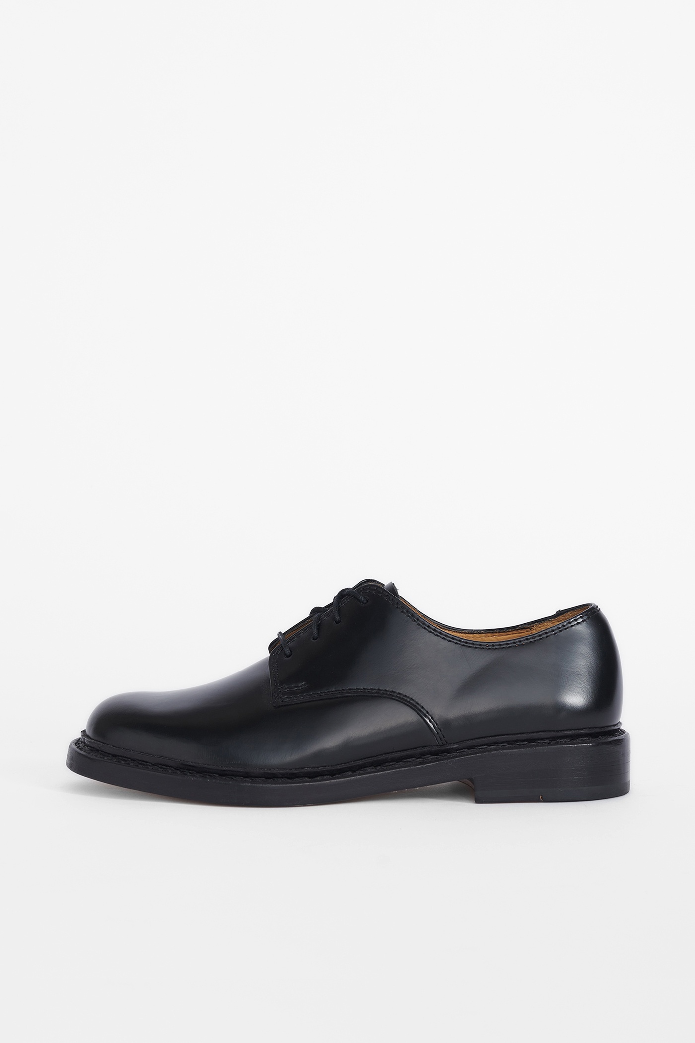 Details · Italian leather · Norwegian welted · Leather outsole · Stacked heel · Leather lined · Derby style · M1937UPBL Description Our Uniform Parade Shoe in Black Leather. Produced in an Italian leather this classic derby shoe features a Norwegian welted leather outsole, four eyelets and a stacked heel. The Uniform Parade Shoes fit a little large and we would suggest sizing down if you are between sizes. Please note that sizing is mens EU. We recommend going down one size for womens EU equivalent.