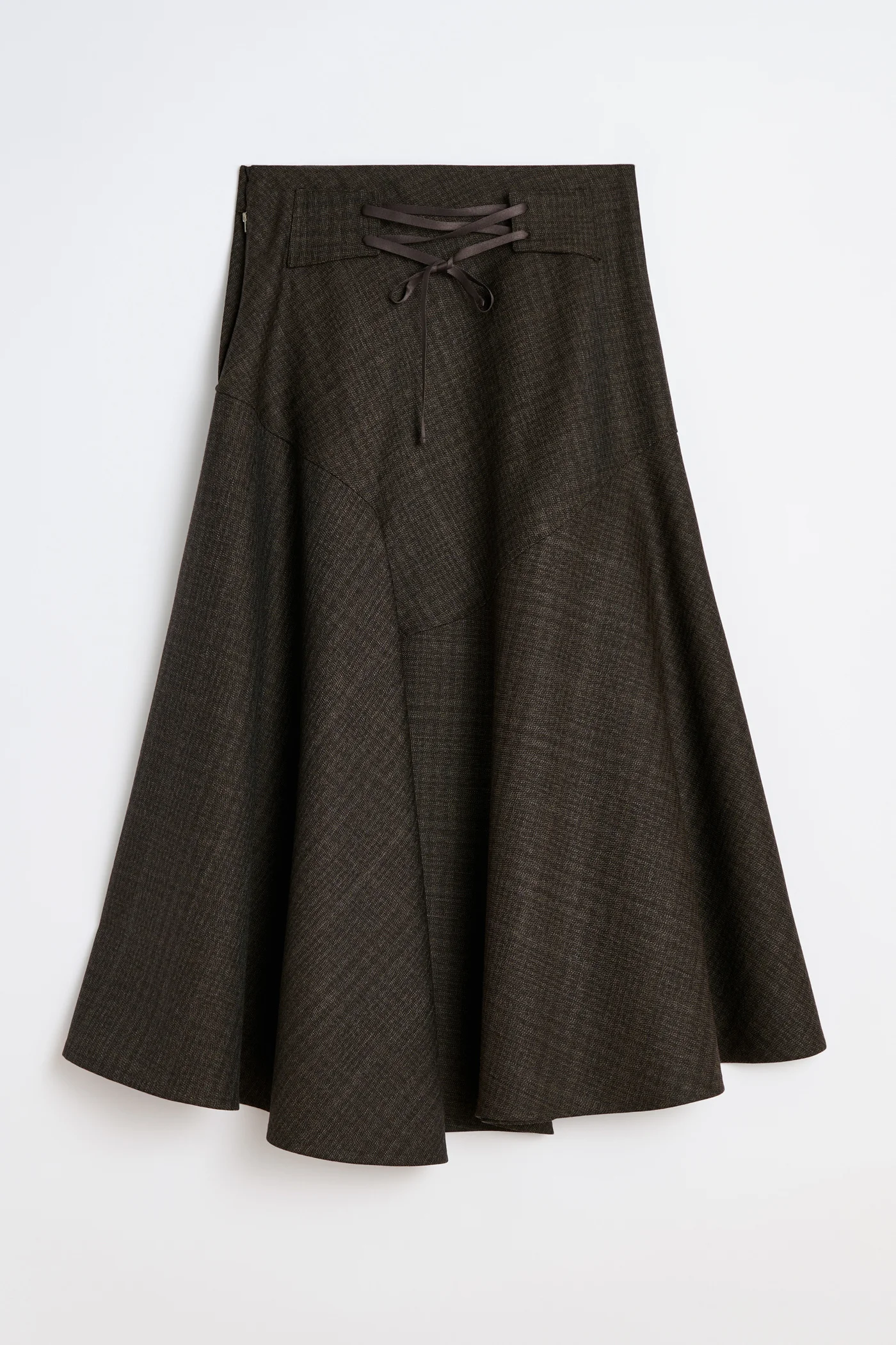 Details · Italian fabric · 100% Virgin Wool · Check pattern · Draping, voluminous silhouette · Back lacing tie panels · Zip and button fly at left side seam · Draping panels all around · Adjustable waist · Generous, flowing fit · W4254WB Description Our Waltz Skirt in Brown Dunmore Check. Produced in Italian virgin wool fabric with a distinctive check pattern, the women's Waltz Skirt has a draping, voluminous silhouette with a generous, flowing fit and features back lacing tie panels for adjustable styling, draping panels all around, a zip and button fly at the left side seam, and an adjustable waist.