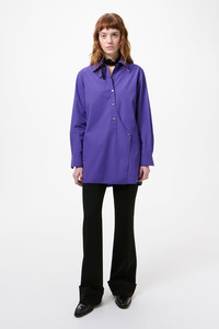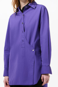 Details · Italian fabric · 100% Cotton · Super poplin · Short front placket with curved extension · Angled buttonhole attaches to extra button · Placket can be unbuttoned and front wrapped · Curved hem with slight side splits · Elongated silhouette · Regular, straight fit · W2262WDB Description Our Wave Shirt in Deep Blue Super Poplin. Produced in an Italian cotton poplin fabric, the high-twist construction gives the fabric a crisp hand, durability and a refined drape. The Wave Shirt has an elongated silhouette with a regular straight fit and features a short front placket with a curved extension. The extension includes an angled buttonhole that fastens to an extra button on the left side to create a semi-wrap look; the placket can also be unbuttoned and the front wrapped for a slouchy blouse effect. The shirt is finished with a gracefully curved hem and slight side splits.