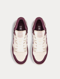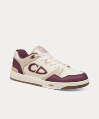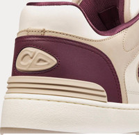 Dior - B57 Baskets basses en cuir de veau lisse bordeaux et crème avec empiècements en daim beige Les baskets basses Dior B57 pour homme, en cuir de veau lisse bordeaux et crème avec empiècements en daim beige, présentent la signature CD en cuir sur les côtés, la languette ornée du logo Dior B57, la signature CD au talon, une tige mi-haute avec cheville rembourrée, une fermeture à lacets avec œillets bicolores siglés CD, des perforations sur le bout, une doublure en mesh technique, une semelle extérieure en caoutchouc signée Dior et une construction soudée et cousue sur les côtés. Fabriquées en Italie.