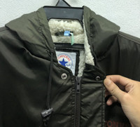 *4 Stay warm and stylish with this rare vintage Converse Chuck Taylor All Star hooded jacket. Featuring the iconic All Star logo on the back, this coat comes lined with ultra-soft sherpa fleece, perfect for colder weather. Key Features: Size: Large (L) Color: Black Outer: 100% Nylon Lining: Polyester & Acrylic Sherpa lining for extra warmth Adjustable hem drawstrings Made in Indonesia Classic Chuck Taylor logo on the back and inside label Care tags with Japanese instructions Tag Size :- L (All measurements were taken lying flat) Actual size Manual Measurements (approximately): Armpit to Armpit: 26 inches Length from top of Shoulder: 34 inches Shoulder to Shoulder: 21 inches Sleeves Length: 25 inches Condition: An item that has been used or worn previously. See Our listing for full details and description of any imperfections. Please don't expect it to be like new Kindly see all pictures Thank you so much for your visit PAYMENT And SHIPPING: ¦Accept "PAYPAL" Only ¦This item will be ship along with Tracking Number after received a completed payment. all item will be shipped within 2-3 days after receive clear payment. post via international registered/signed for with tracking number. -PLEASE MAKE SURE YOUR ADDRESS IS COMPLETE AND CORRECT. -KINDLY LEAVE YOUR PHONE NUMBER FOR REFERENCE. Etc: Don't Worry About Customs Tax or Fees. I usually Declare all Items as 'Gift' & Declare Value of Item Lower than Original Price. All Items are Sold "AS IS" so Please be Sure to Read The Entire Description and Look at All The Pictures. Any Question and More Details Please Don't Hesitate to Contact Me. ATTENTION : Please pay close attention to measurements provided. Do not rely on tag size as pre-worn items may have been altered, stretched or shrunk & vintage sizes do not directly translate the modern sizes.The best way to ensure a correct fit is to compare our measurements with the measurements of a similar item that you know fits you well.Please enlarge the photos for clearer image. no return and refund.
