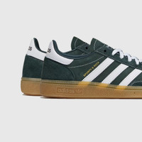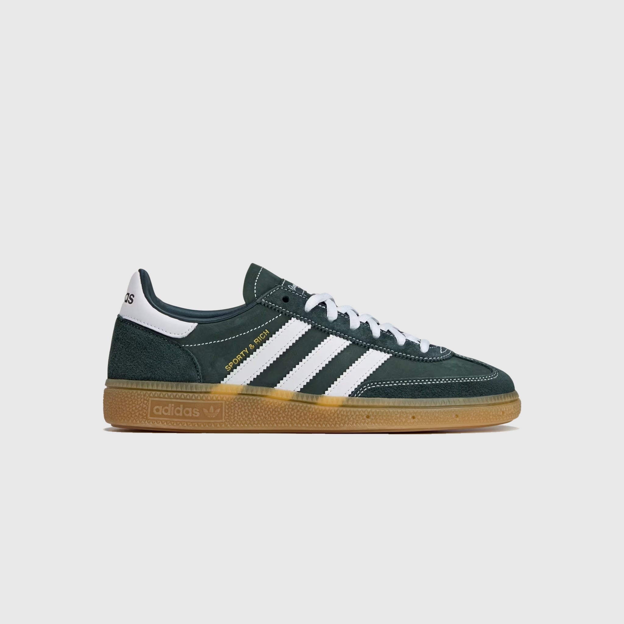 - JP7067 - Dark Green/Cloud White/Gum 3 - Elevated minimalism and vintage combine on the Sporty & Rich x Adidas Handball Spezial. - Smooth leather upper - Suede overlays - Leather three-stripe branding across the lateral and medial sidewalls - Smooth leather tongue with a branded tongue tag - "SPORTY & RICH" branding on the medial side - Debossed branding at the heel - Lace closure - OrthoLite® midsole - Gum rubber outsole