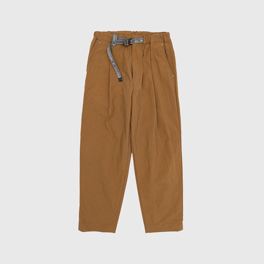 - 574-3282082-050 - Brown - 100% Nylon - Nylon Taslan yarn - Water repellant - Front zipper and button closure - Adjustable belt at the waist - Two side welted pockets - Two back welted pockets - Embroidered branding - Single pleated front - Tapered fit