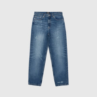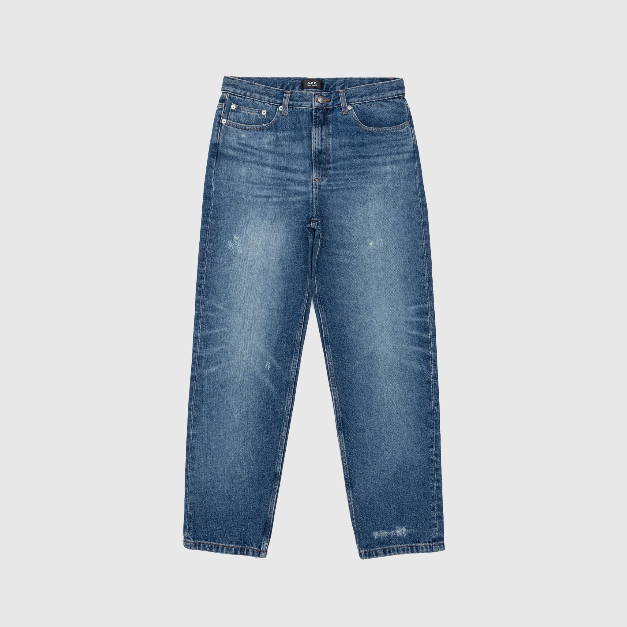 - COHFC-H09121-IAL - Washed Indigo - 100% Cotton - Japanese canvas denim - High rise - Zipper and button closure - Two front side pockets with coin pocket - Two back pockets - Distress detailing throughout - Straight fit