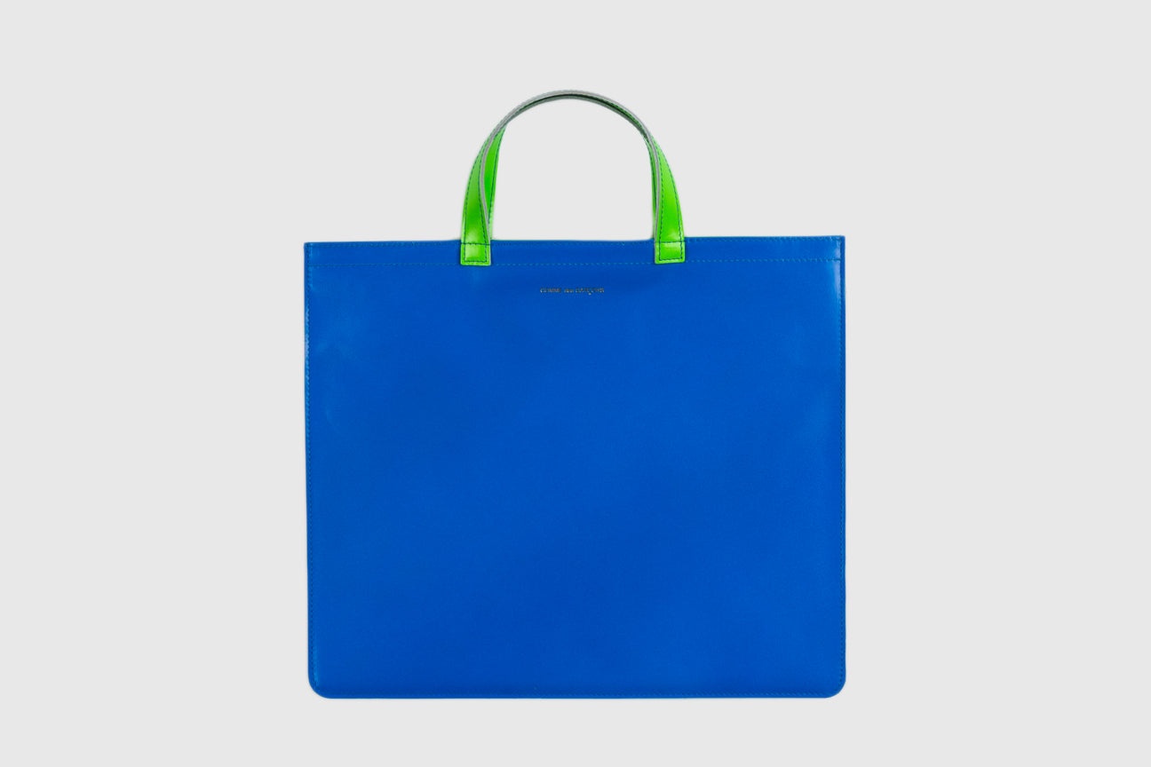 - SA9000SFBLU - Blue/Orange - 100% Cowhide Leather - Two handle tote - Two-tone panelling - Gold foil branding - Interior zipper pocket - Cotton lining - H33cm x W36cm