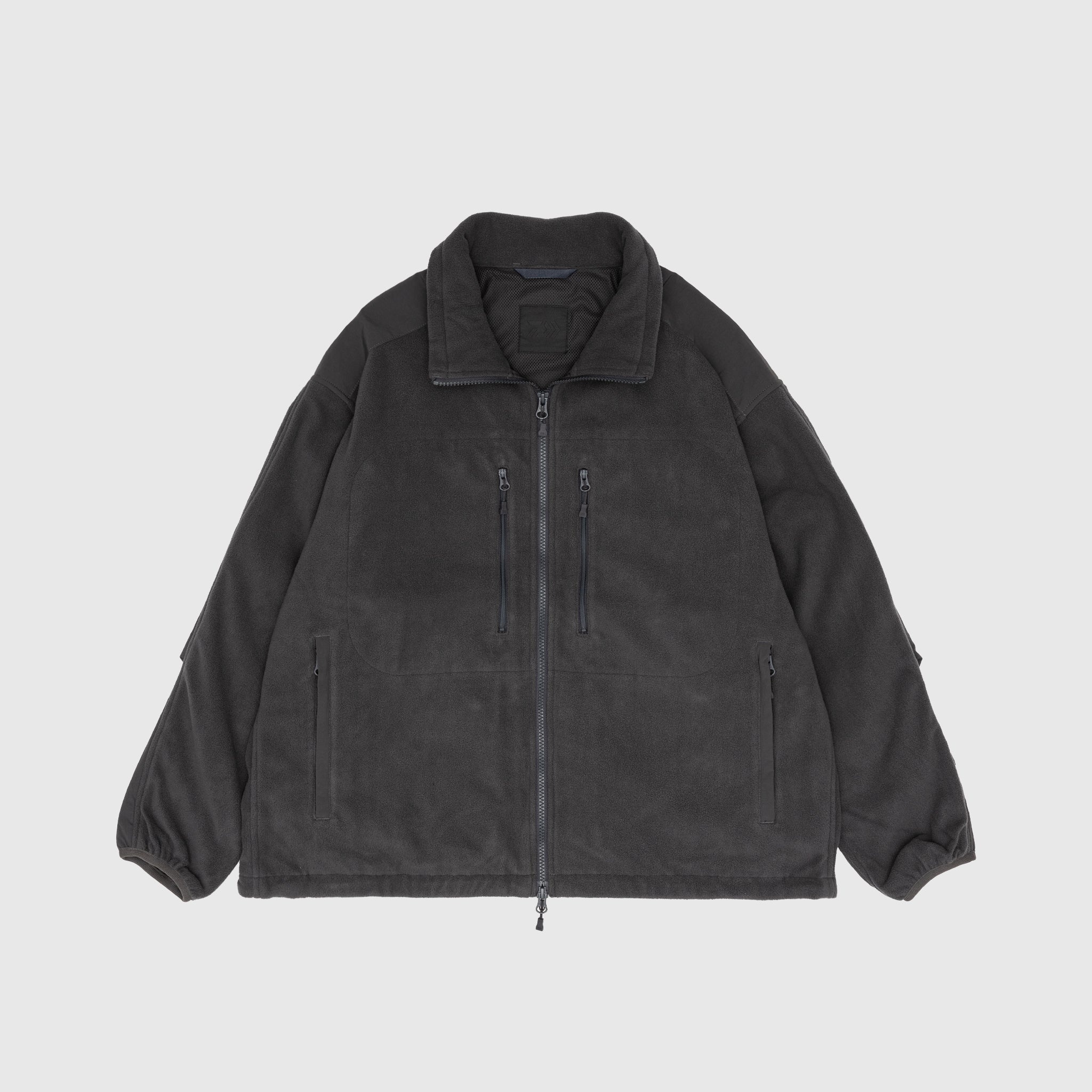 - 88-18-0089-704-17 - Charcoal - 100% Polyester - Lining: 100% Polyester - Microfleece - Front two-way zipper closure - Two front chest pockets with zipper closure - Two front side pockets with zipper closure - Multiple interior pockets - Elastic trim cuffs - Adjustable drawcord hem - Action pleats at the arm - Stand up collar