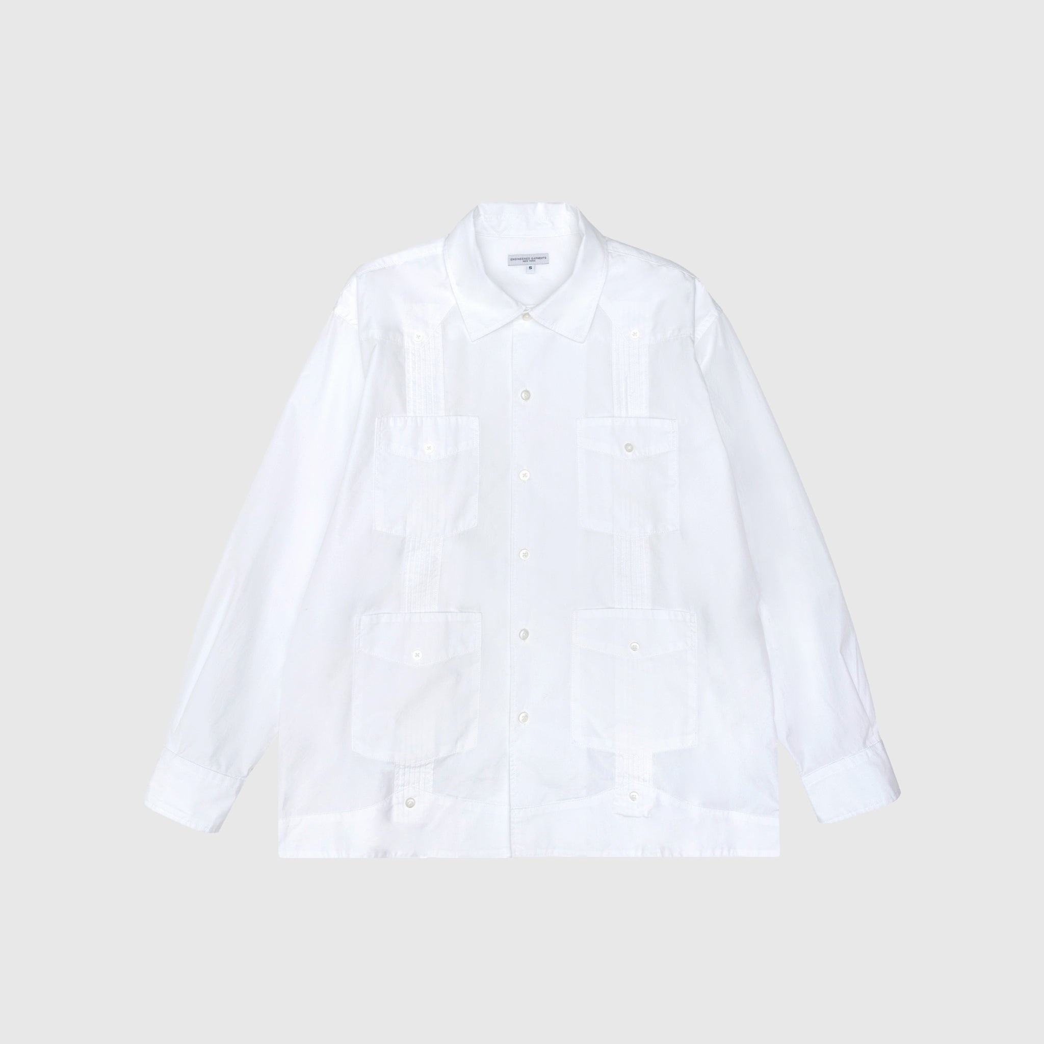 - 25S1A032-ET002 - White 100's 2Ply Broadcloth - 100% Cotton - Front button closure - Four front pockets with flap and button closure - Button detail at the front and back hem - Pin tuck detailing at the front - Button vent at side seams - Adjustable button cuffs - Dropped shoulder - Made in USA
