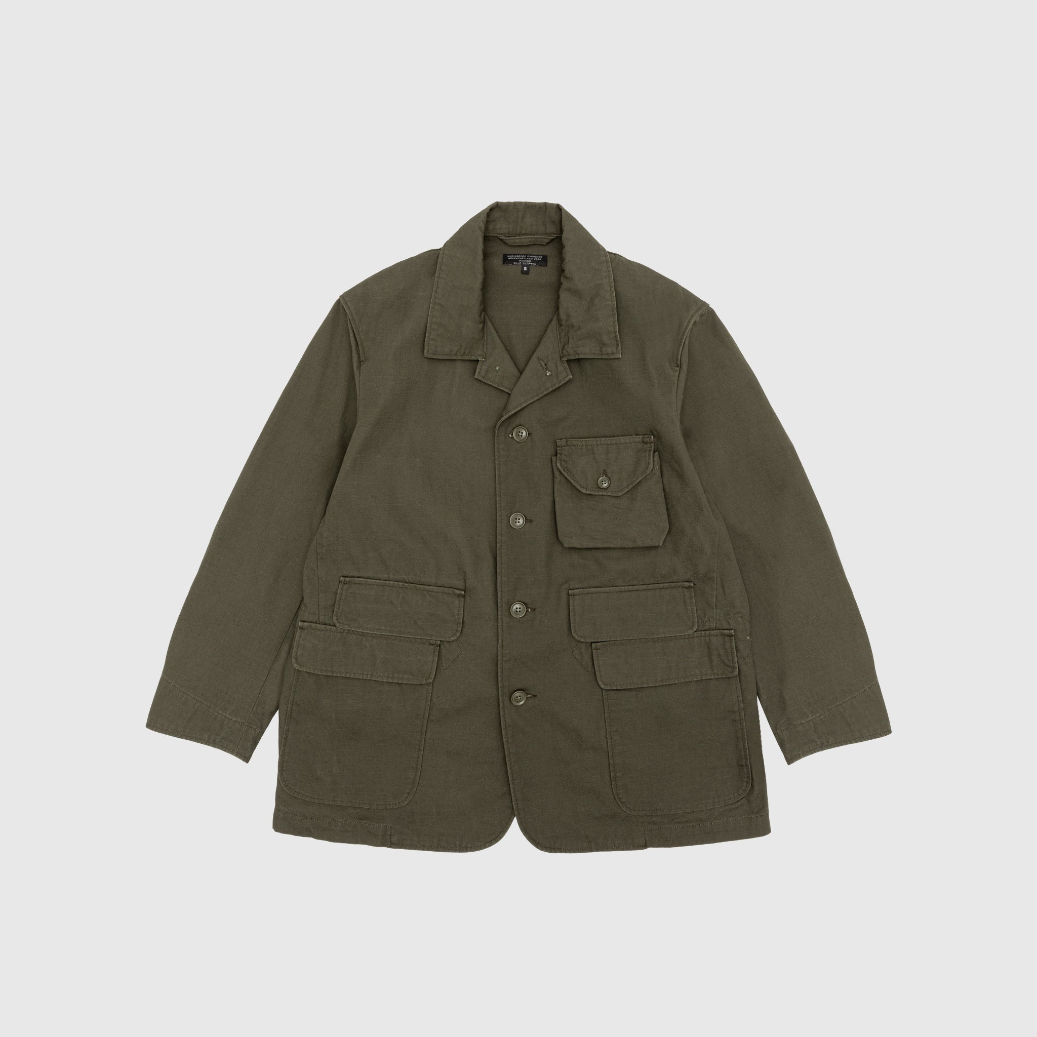 - 24F3NBG001-BK002 - Olive Heavyweight Cotton Ripstop - A collaborative execution of iconic silhouettes re-tooled by Nephentes NY, Engineered Garments, Packer, and Blue In Green. - 100% Cotton - Heavyweight cotton ripstop - Front button-up closure - Front chest pocket with flap and button closure - Two welted pockets with flap closure - Two front patch pockets with flap closure - Adjustable button cuffs - Vents at the back - Integrated vest - Made in USA