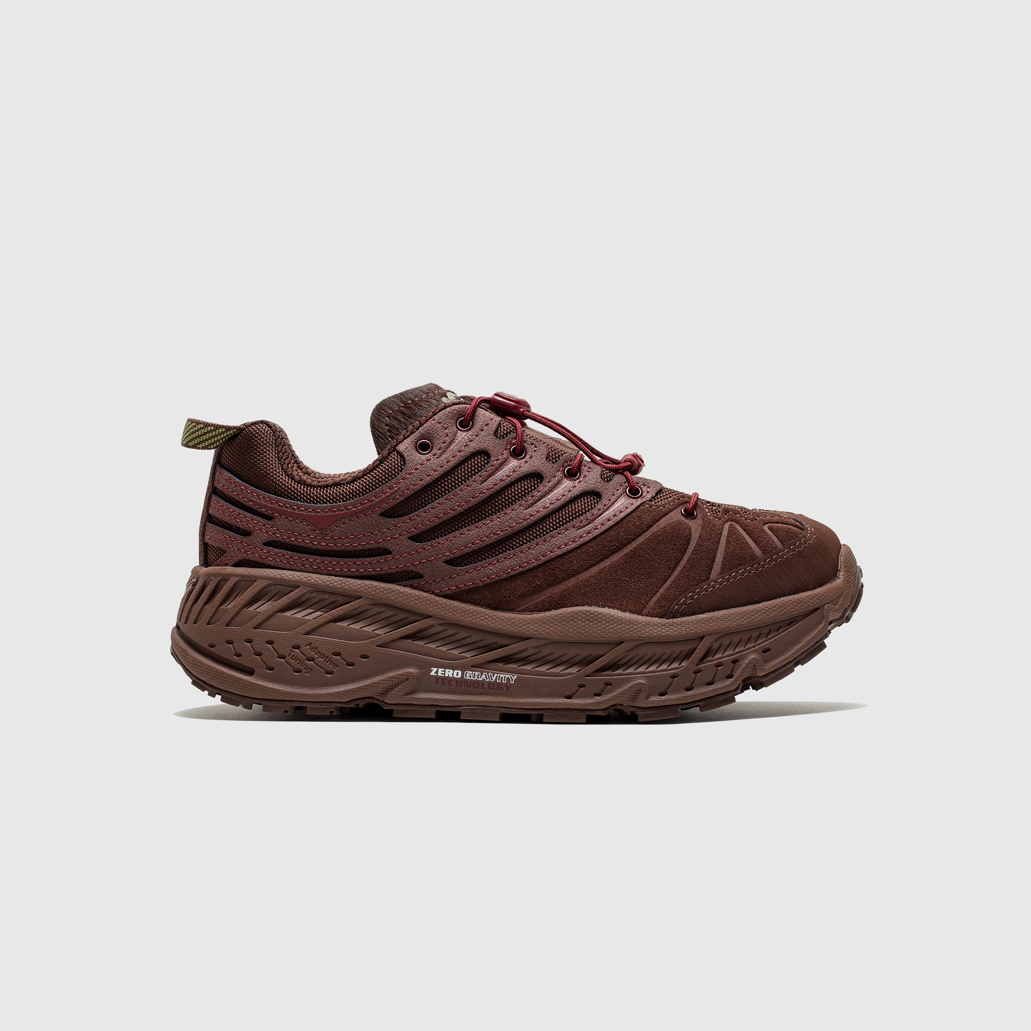 - 1166450-CWV - Cold Brew/Varsity Burgundy - Hoka updates the Stinson Evo OG - Mesh upper - Premium suede and synthetic overlays - Suede back heel with debossed branding - Gusseted tongue with suede top and debossed branding - Canvas pull tab at the back heel - Late stage Meta-Rocker - Quick-lace system - Zero gravity technology - Full-length CMEVA midsole - Lugged rubber outsole