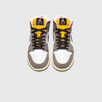 - HQ2011 100 - White/Oil Grey-Cave Stone-Dark Sulfur - A mid-cut iteration of the iconic Air Jordan 1 - White leather upper - Cave Stone textile overlays - Black leather swoosh - Dark Sulfur nylon mesh tongue with "AIR JORDAN" tongue tag - Black Jordan's "WINGS" logo on the side - Sail rubber midsole - Black rubber outsole
