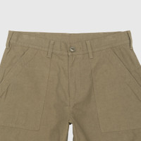 - 251ZANH-PTM08-OLDB - Olive Drab - 73% Cotton, 27% Linen - Cotton Twill - Front zipper and button closure - Two front patch pockets - Two patch pockets in the back - Woven label on the side seam - Woven label on the back - Relaxed fit - Made in Japan