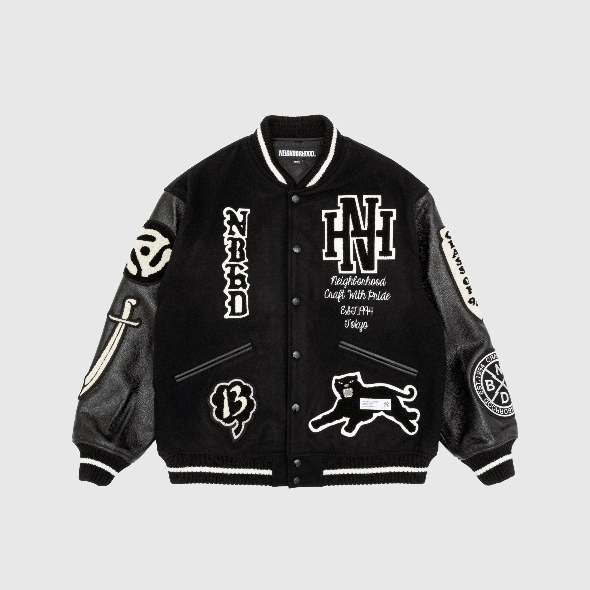 - 232SZNH-JKM03-BLK - Black - 90% Wool, 10% Nylon - Taffeta quilted liner - Front snap closure - Two front welt pockets - Chenille patches throughout - Embroidery applications on chest - Textured cow leather sleeves - Ribbed cuff and waist - Woven label at the front