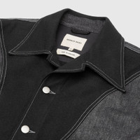 - ND-AW24-RBJ1-WOCO-BK - Black - 100% Cotton - Contrast: 100% Wool - Linning: 100% Cotton - Paneled design - Front button closure - Pointed collar - Two front pockets - Contrast stitching throughout - Leather branded patch at the back - Adjustable button cuffs - Made in England