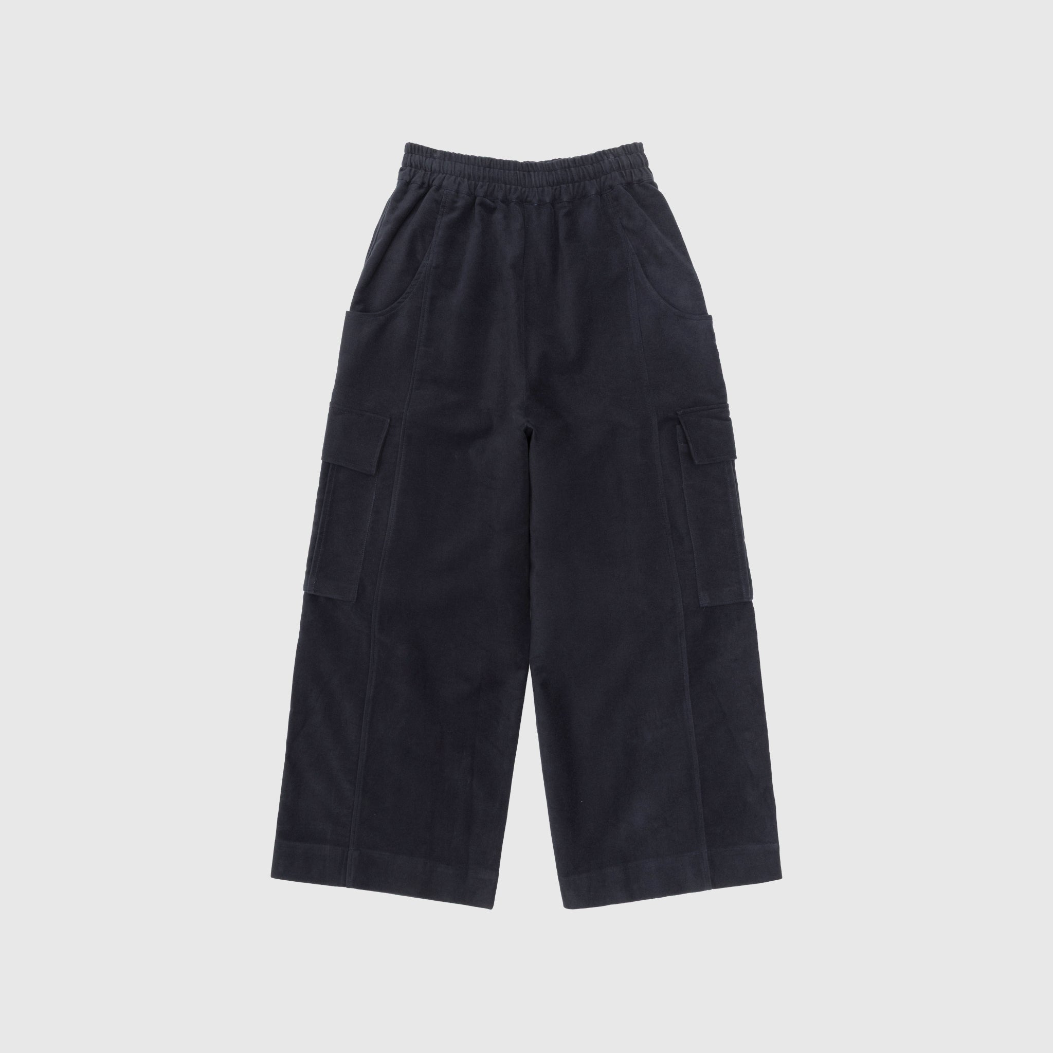 - ND-AW25-WCP-BRP-NVY - Navy - 100% Cotton - Brushed Flannel - Elastic waistband with adjustable drawstring - Two rounded side pockets - Two front-side cargo pockets with a flap closure - One patch pocket in the back with a flap closure - Pleated front - Wide leg - Made in England