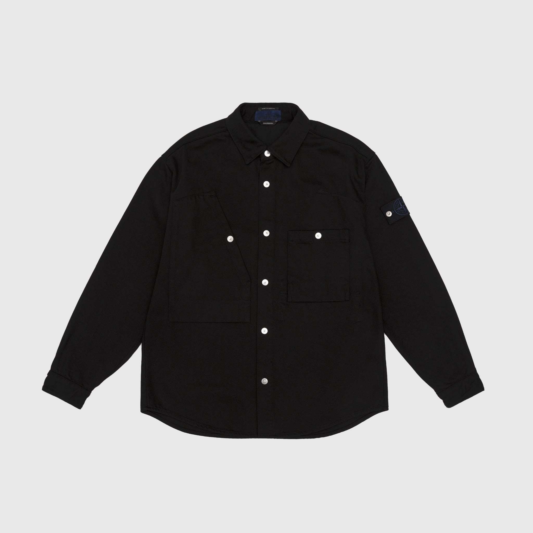 - K2S151100008S00J5 V0029 - Black - 100% Cotton - 13.5oz Denim - Garment dyed - Front snap button closure - Two front chest pockets with snap button closure - Removable Stone Island Denim Research badge on the left arm - Adjustable button cuffs - Curved hem - Regular fit