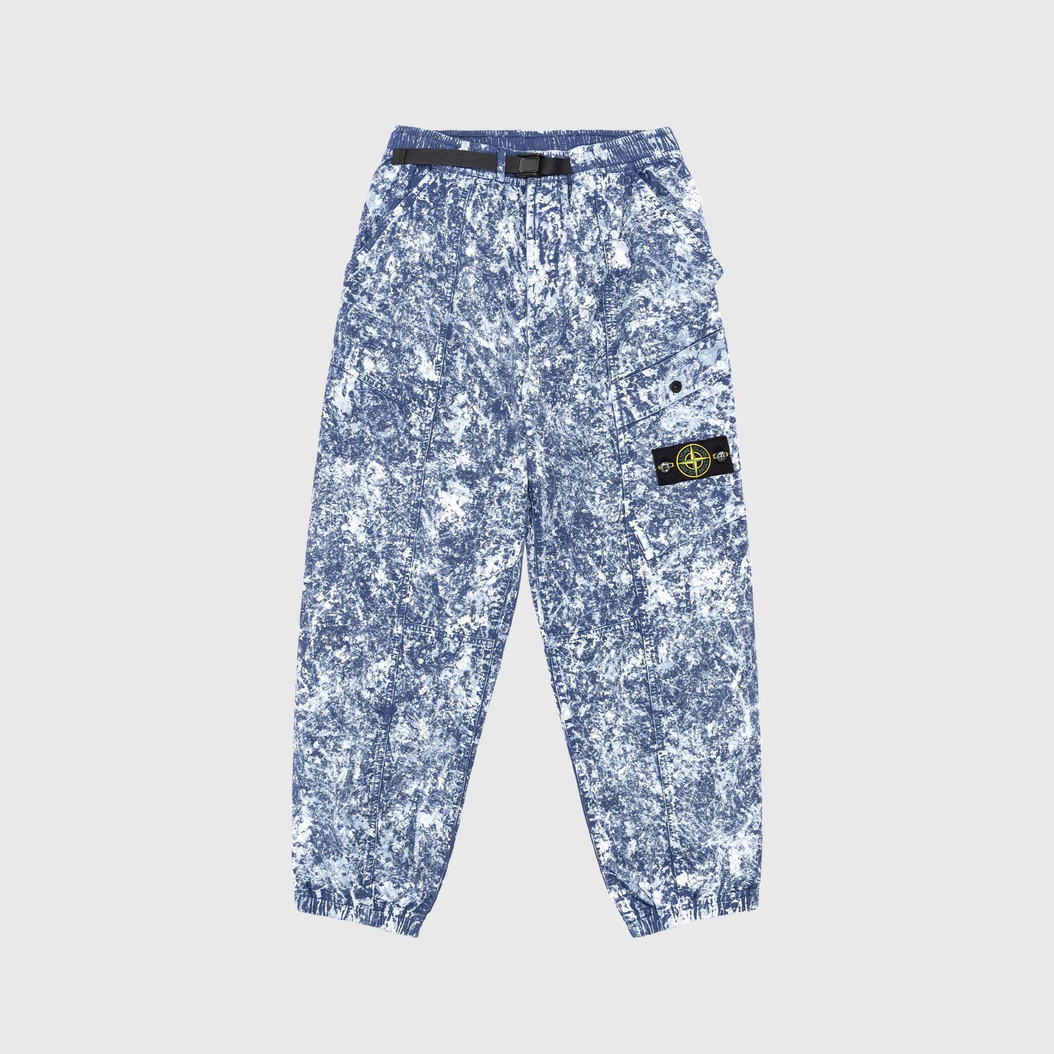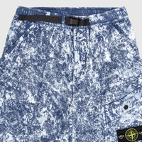- K1S153100016 SA143 V0028 - Marine Blue - 100% Cotton - Stretch cotton - Garment dyed - Elasticated waist with nylon tape buckled belt - Two side welted pockets - One bellow pocket with flap and snap button closure - One back welted pocket with snap button closure - Removable Stone Island badge on the left leg - Elasticated cuffs - Made in Italy