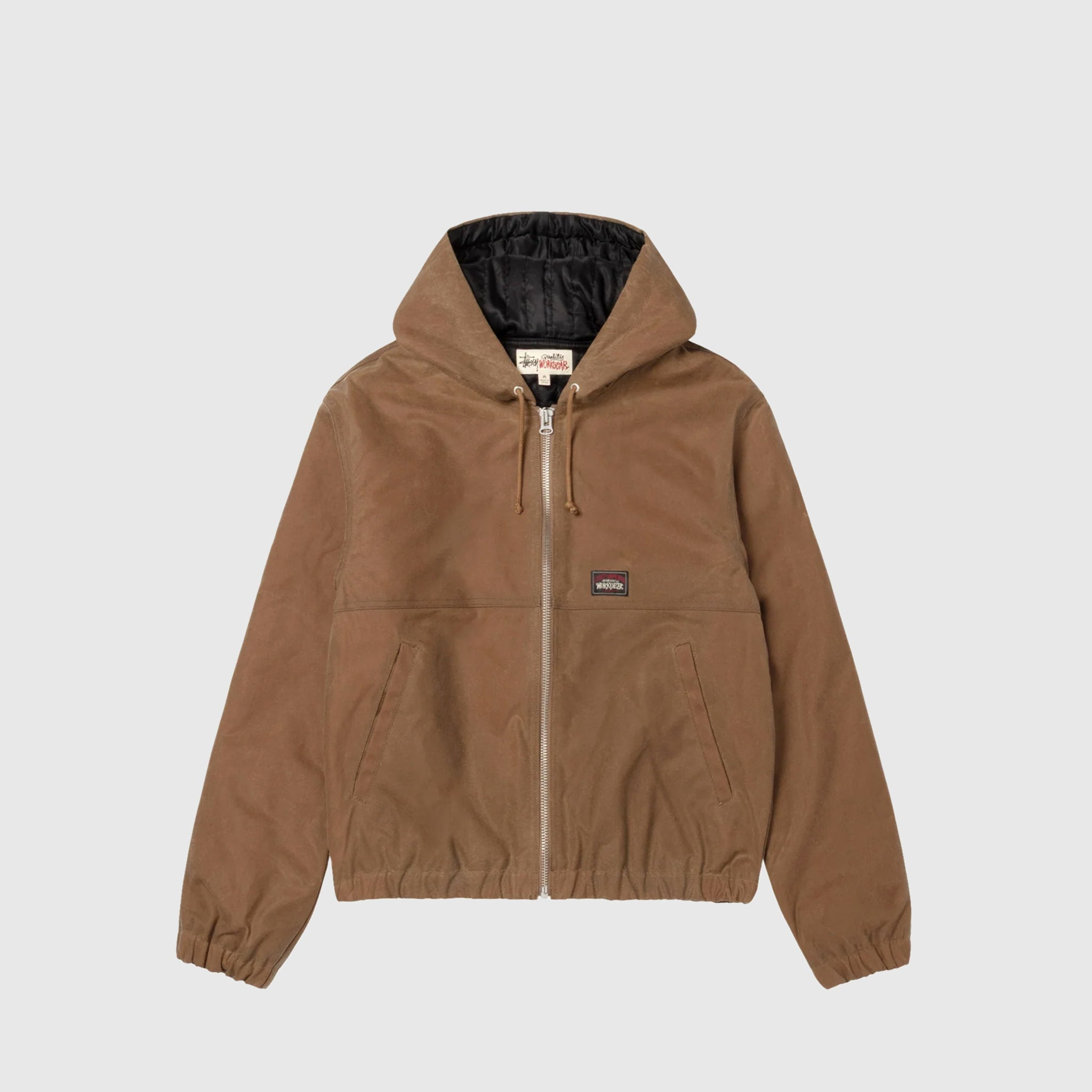 - 115859-KHA - Khaki - 100% Cotton - Lining: 100% Polyester - Halley Stevensons Waxed cotton - Insulated quilted lining - Front zipper closure - Pullover hood with adjustable drawstring - Two front welted pockets - Stussy Workgear label - Elastic cuffs and hem - Boxy fit