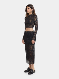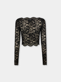 Fitted long sleeve crop top in lace. - Color : Black - Double lace lining - Soft, stretchy material - Boat neck - Long sleeves - Scalopped edge - Composition : 90% Polyamide, 10% Elastane - Made in Tunisia Size & Fit - Model's height: 177 cm / 5ft 9,5in - Model wears a size FR 36 / UK 8 / US 4 - This style is true-to-size - We recommend your usual size