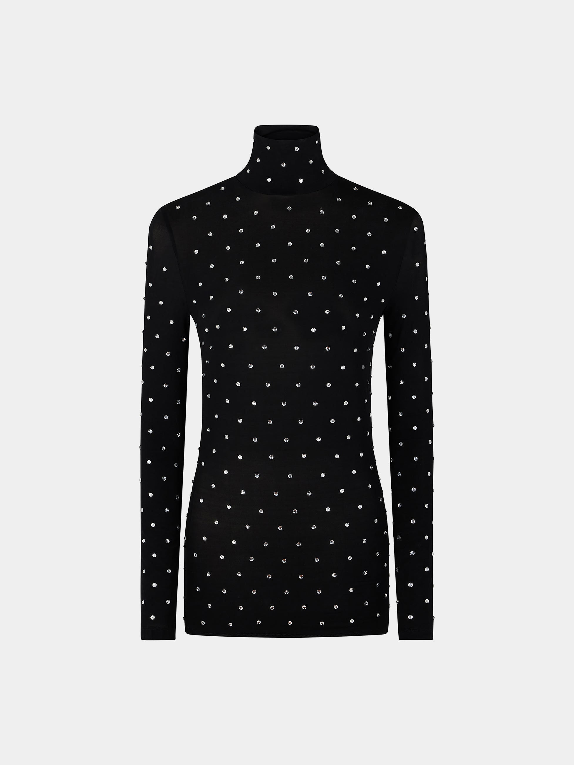 Crystal-embellish high neck top in second-skin jersey. - Color : Black - No lining - Soft, stretchy material - Stand collar - Long sleeves - Crystal-embellished - Composition : 90% Cupro, 10% Elastane - Made in Portugal Size & Fit - Model's height: 177 cm / 5ft 9,5in - Model wears a size FR 36 / UK 8 / US 4 - This style runs large - If you are between two sizes, choose the size below. Otherwise, choose your usual size.