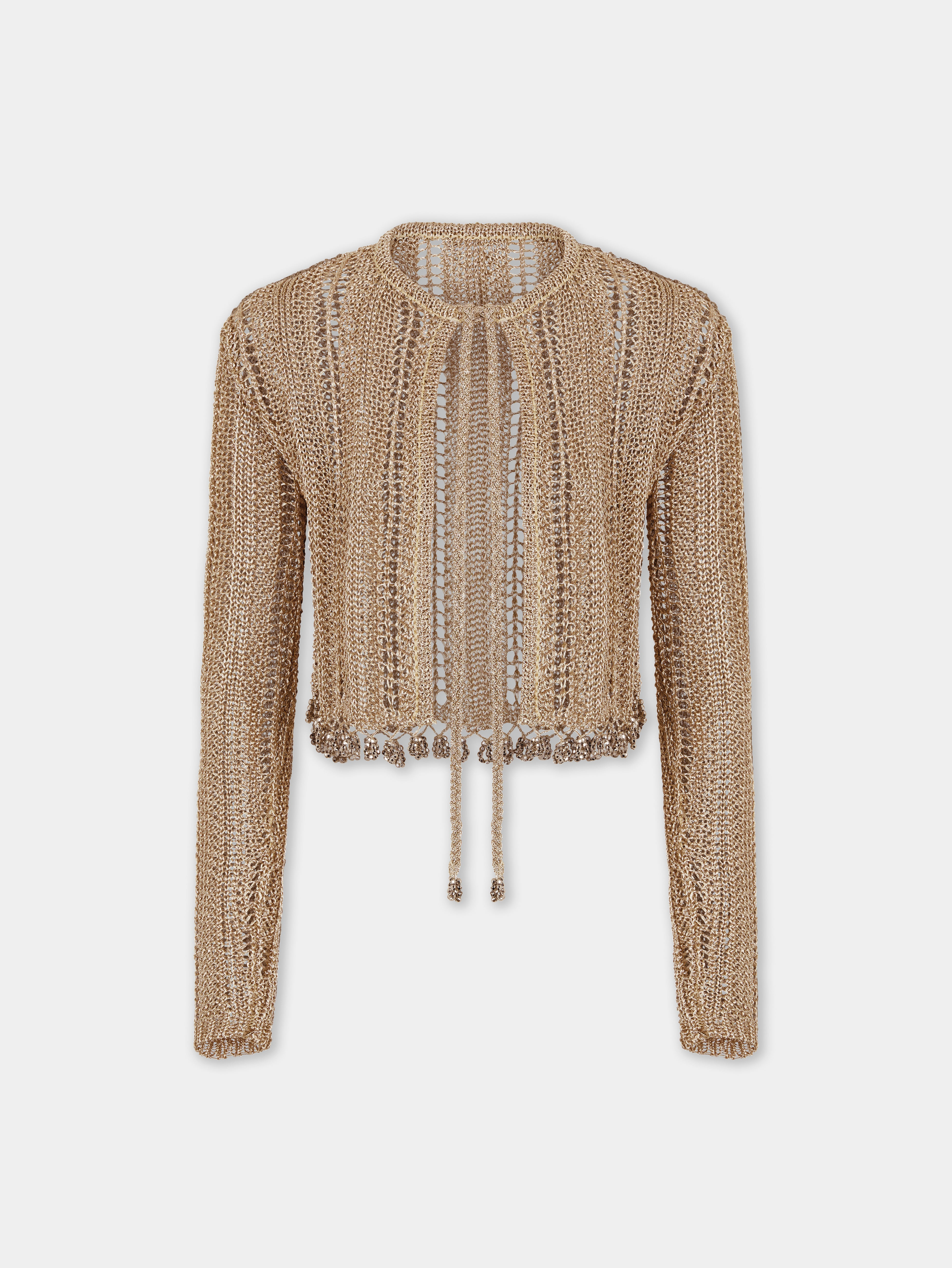 Crochet long-sleeves cardigan adorned with silver beads. - Color : Light gold - Crew neck - Long sleeves - Details of silver pom-pom bead embroidery. - Closure with tie to be knotted at the neckline at the front. - Composition : 65% Viscose, 20% Paper, 15% Nylon - Made in China Size & Fit - Model's height: 180 cm / 5ft 11in - Model wears a size FR 36 / UK 8 / US 4 - This style is true-to-size - We recommend your usual size.