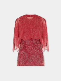 Sleeveless crepe top with chiffon cape and embroidered firework pearl details. - Color: Red wine - Short sleeves - Round neck - Removable cape - 100% Polyester - Made in Madagascar Size & Fit - Model's height: 180 cm / 5ft 11in - Model wears a size FR 36 / UK 8 / US 4 - This style is true-to-size - We recommend your usual size.