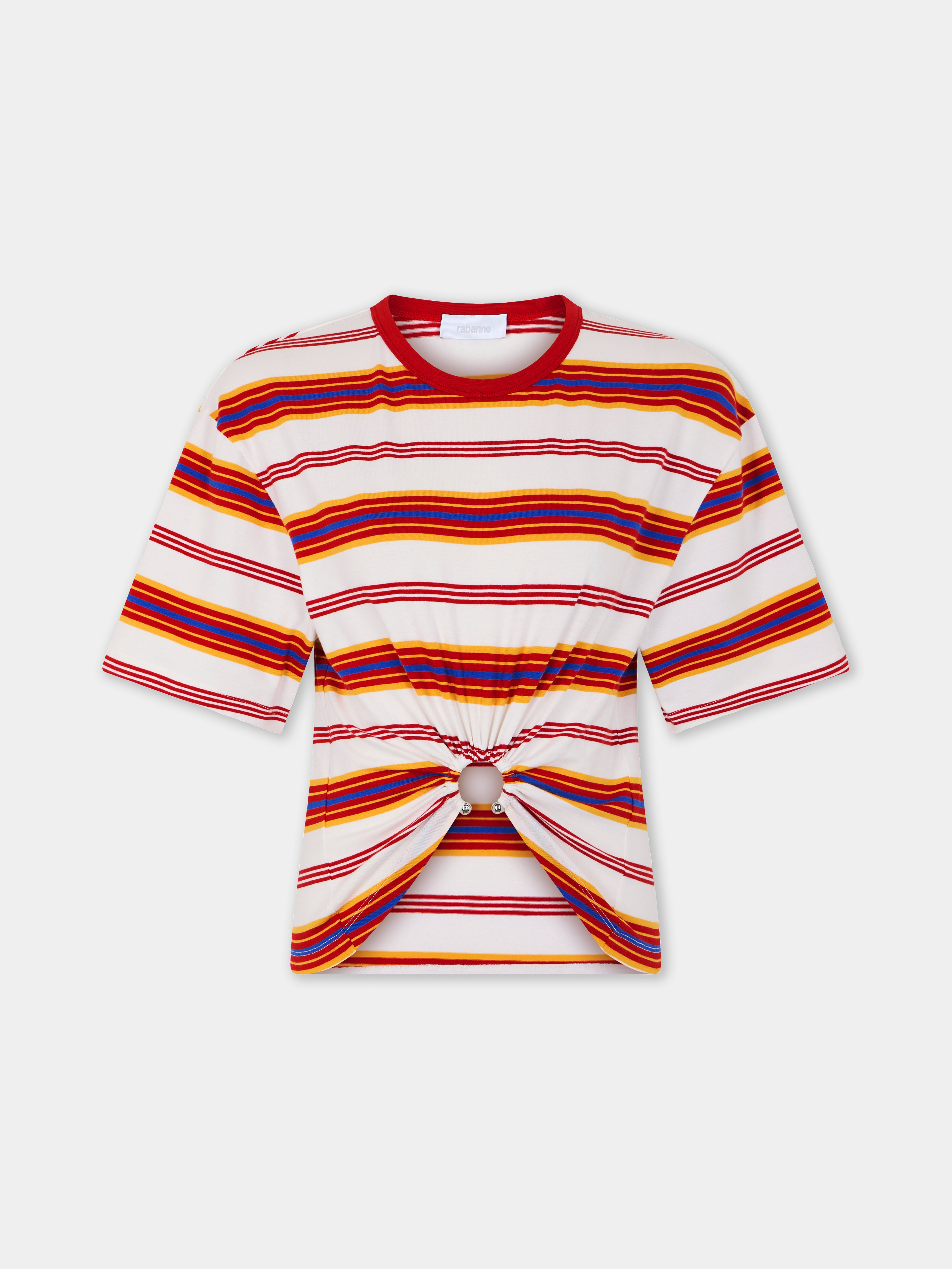 - Color: Cream, orange, and blue stripes. - Crew neck - Short sleeves - Cropped length - Silver piercing detail on the front. DETAILS - Composition: 96% Cotton, 4% Elastane - Made in Portugal - Model's height: 180 cm / 5ft 11in - Model wears a size FR 36 / UK 8 / US 4 - This style is true-to-size - We recommend your usual size.