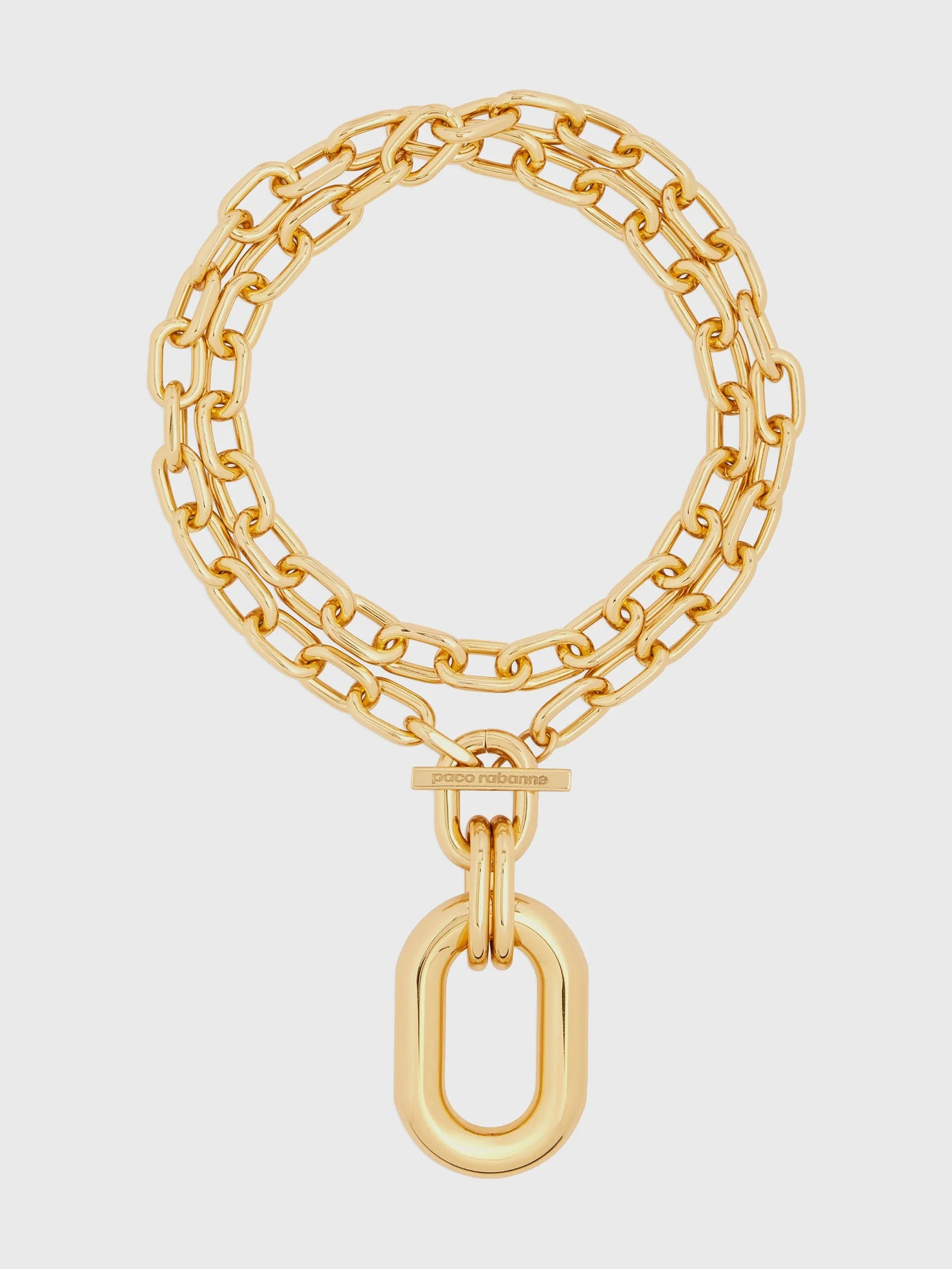 The XL Link collection by Rabanne is made up of jewelry in large meshes intertwined with elegant roundings. True odes with timeless charm, these Palladium jewelry testifies to the contemporary vision of its creator. DETAILS - Composition : Aluminium, Brass - Gold-tone - Engraved logo - Loop oversize pendant - Chunky cable-link chain - Front toggle fastening