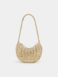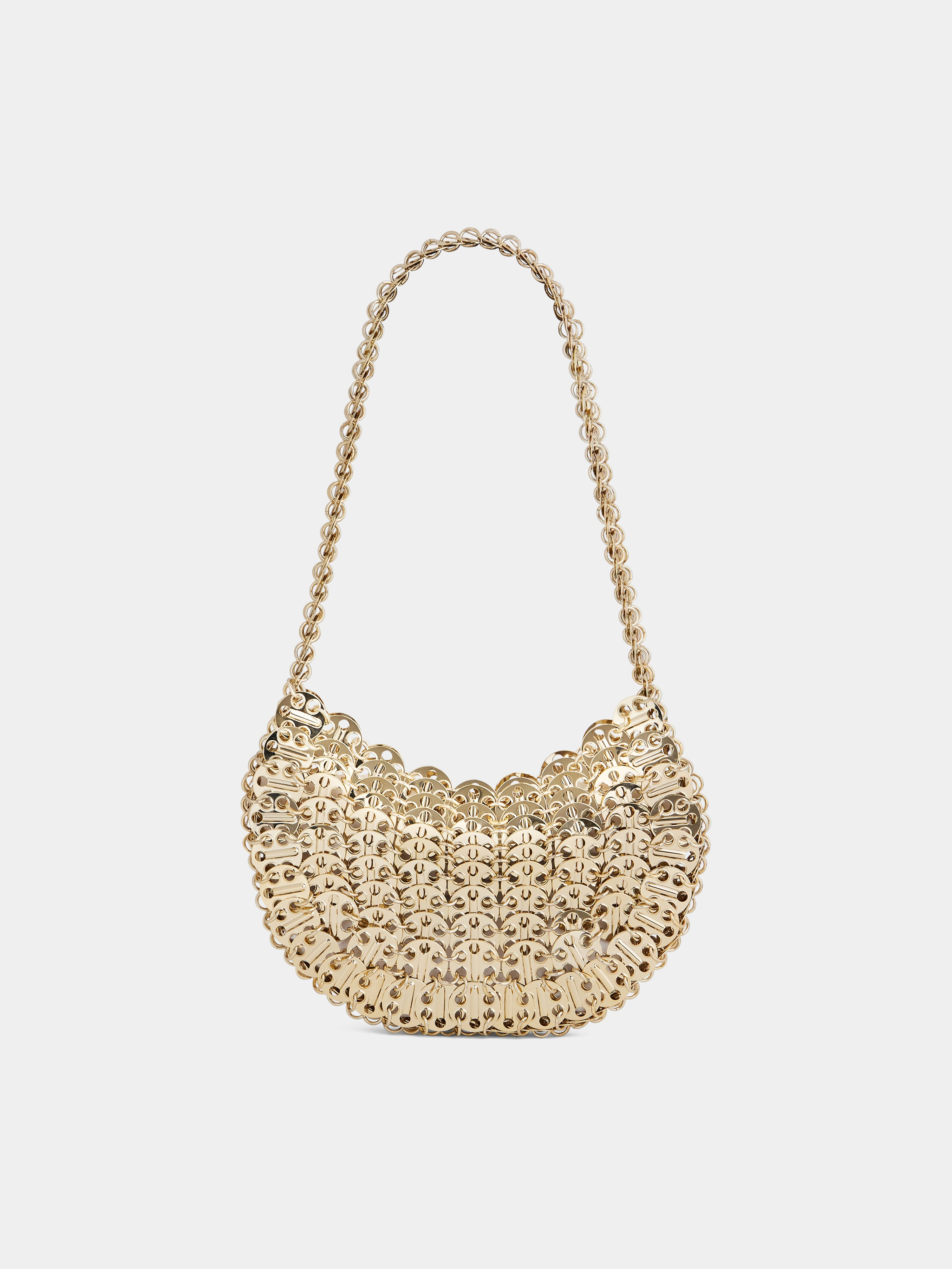 Crafted from hand-assembled metallic pieces, the 1969 moon bag designed in a gold color enhanced is a timeless and unique piece symbolizing the Rabanne aesthetic. - 262 gold discs DETAILS Carry over the shoulder or by hand - Width 21cm - Length 38cm - Depth 2,5cm - Weight 0,7kg - Composition : 100% Brass