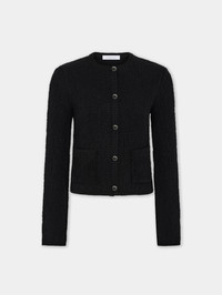 2 pockets on the front of the cardigan. Closure with 5 black and white buttons. - Color : Black - Crew neck - Long sleeves - 2 pockets on the front of the cardigan. - Closure with 5 black and white buttons. DETAILS - Composition : 90% Wool, 10% Cashmere. - Made in Romania - Model's height: 180 cm / 5ft 11in - Model wears a size FR 36 / UK 8 / US 4 - This style is true-to-size - We recommend your usual size.