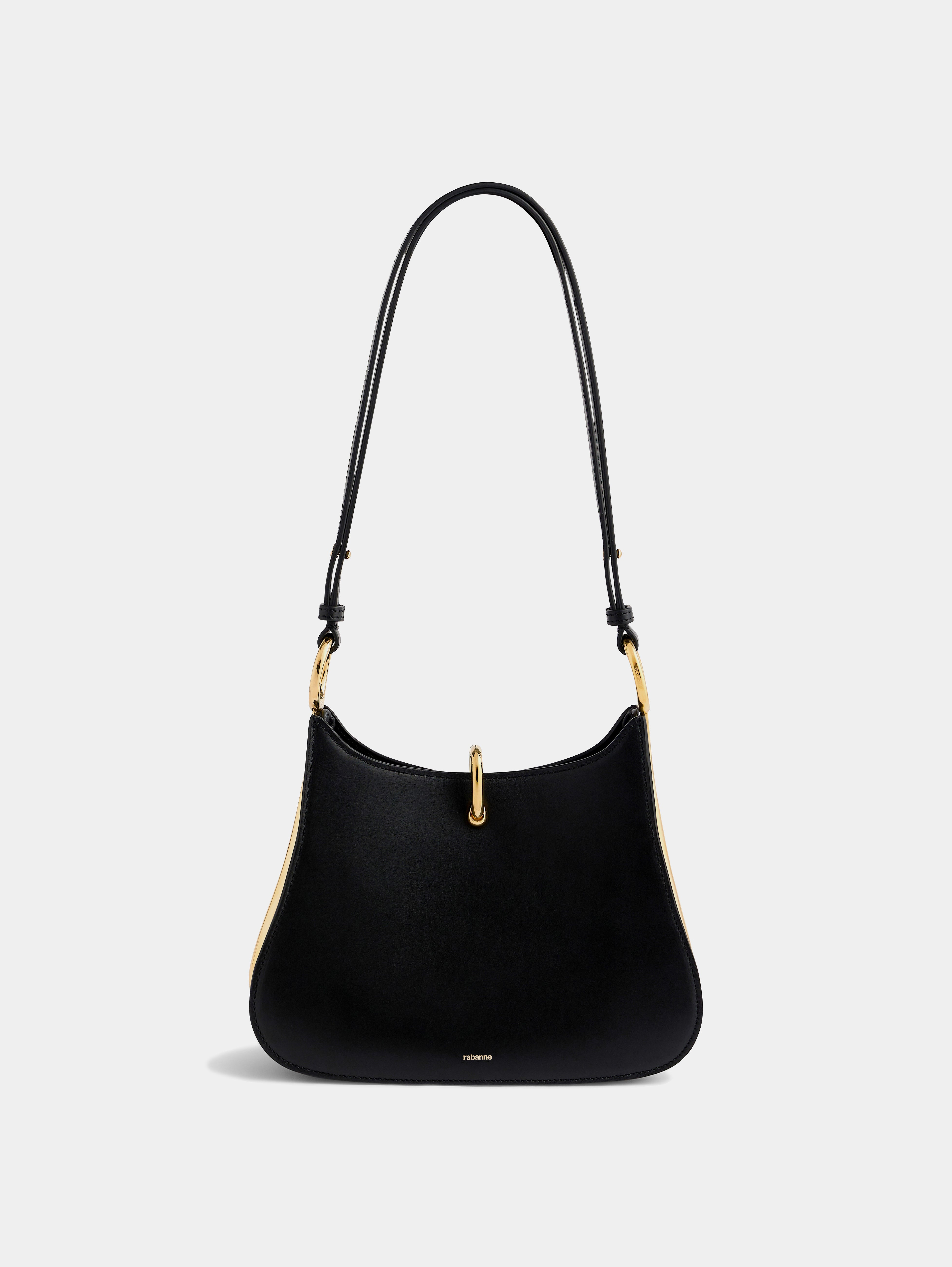 Medium Ring leather bag adorned with gold metallic pieces. - Color : Black - The bag is adorned with a gold metallic frame. Gold ring details. - Adjustable leather strap for multiple carrying options : shoulder and crossbody. - Sliding metallic ring closing system inspired by the iconic Rabanne ring. - Composition : 100% Calfskin - Made in Spain