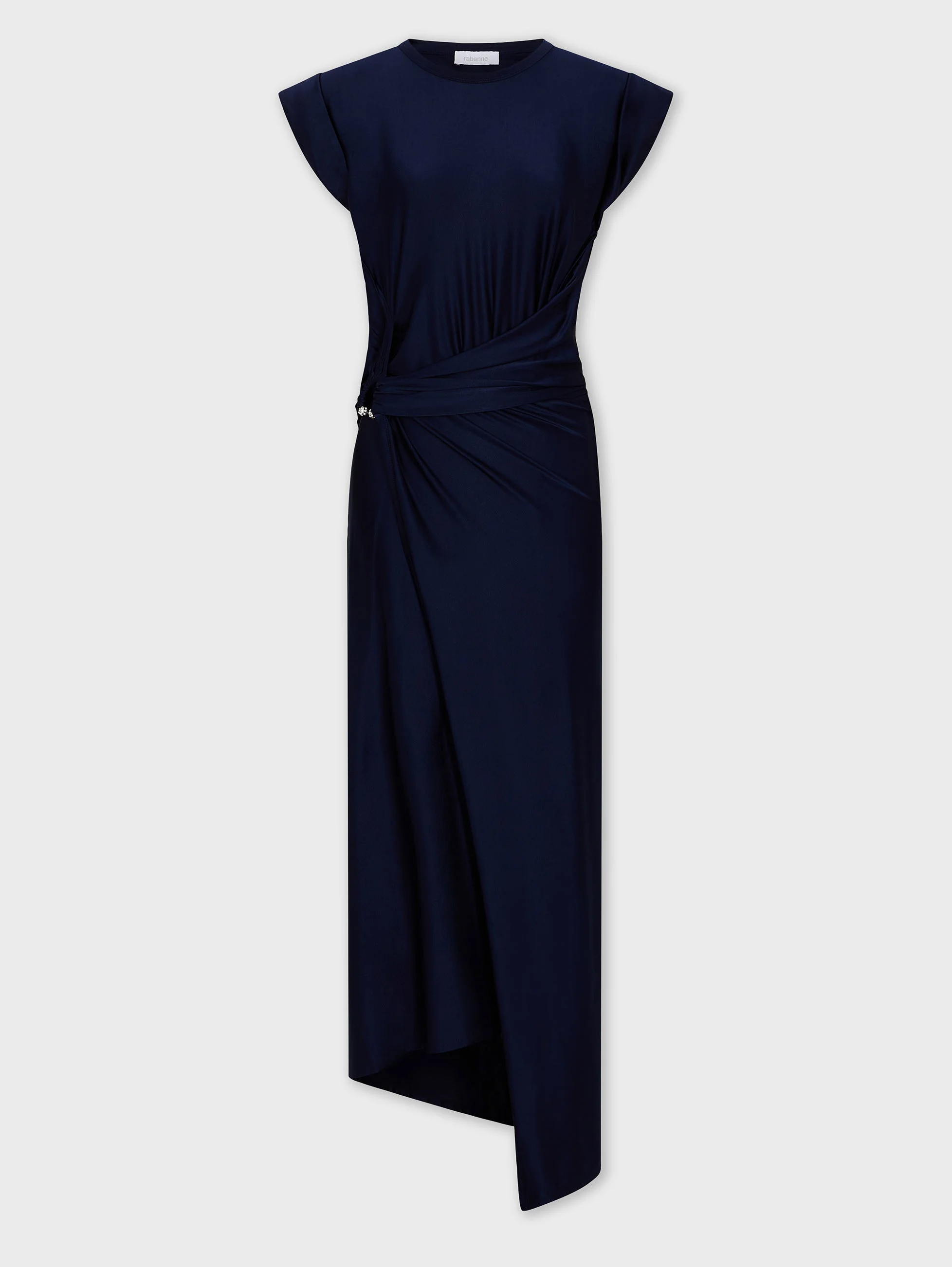 Short-sleeved satin viscose jersey dress with silver piercing detail. - Color: Navy - Short sleeves - Round neck - Midi dress - 90% Viscove, 10% Elasthanne - Made in Portugal Size & Fit - Model's height: 180 cm / 5ft 11in - Model wears a size FR 36 / UK 8 / US 4 - This style is true-to-size - We recommend your usual size.