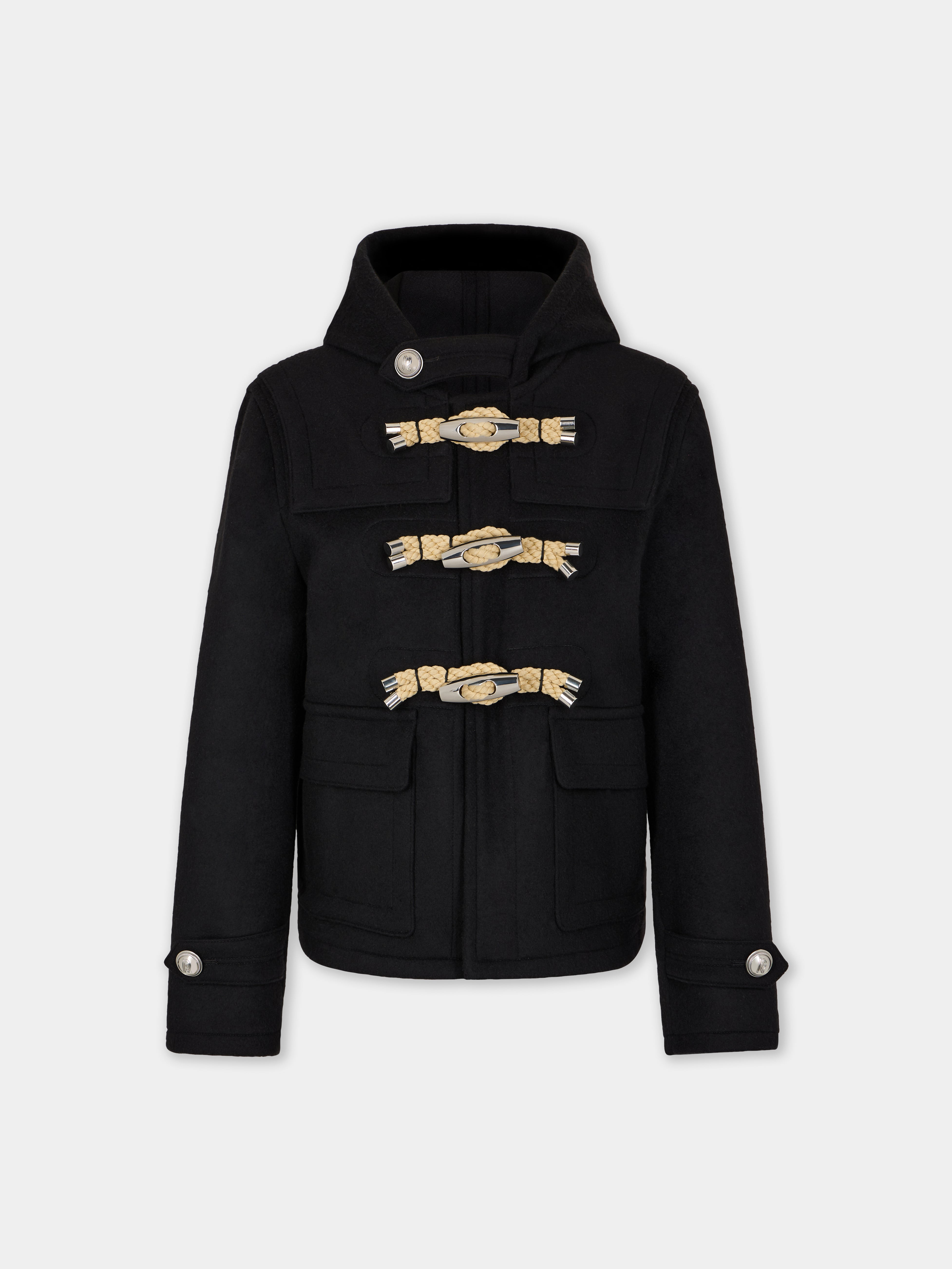 Short coat with a hood and toggle closure in wool. - Color: Black - Stand collar - Long sleeves - Toggle fastening featuring 3 silver buttons and marine-inspired ropes. Silver button details on the collar and cuffs. - Composition: 75% Wool, 25% Polyamide - Made in Morocco Size & Fit - Model's height: 180 cm / 5ft 11in - Model wears a size FR 36 / UK 8 / US 4 - This style is true-to-size - We recommend your usual size.
