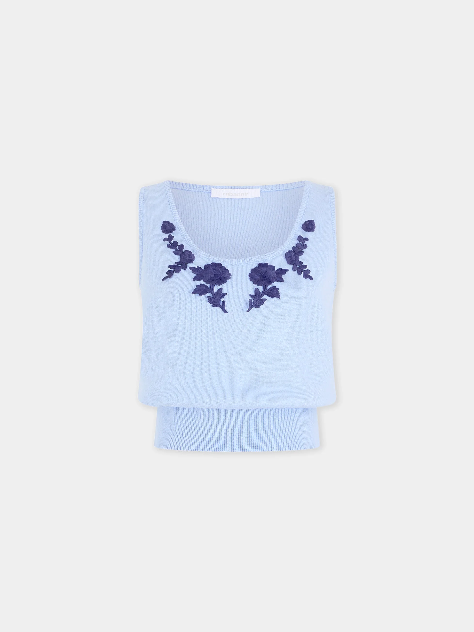 TANK TOP IN BLUE KNITTED WOOL WITH FLOWER EMBROIDERY