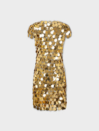 Short-sleeved gold dress assembled with metallic sparkle discs and rings, an iconic design from Maison Rabanne, that gives a mirror effect, reflects the light and shimmers with movement. DETAILS - Washing Instructions : Do Not Wash/Do Not Dry or clean - Composition : 100% Plastic and Metal