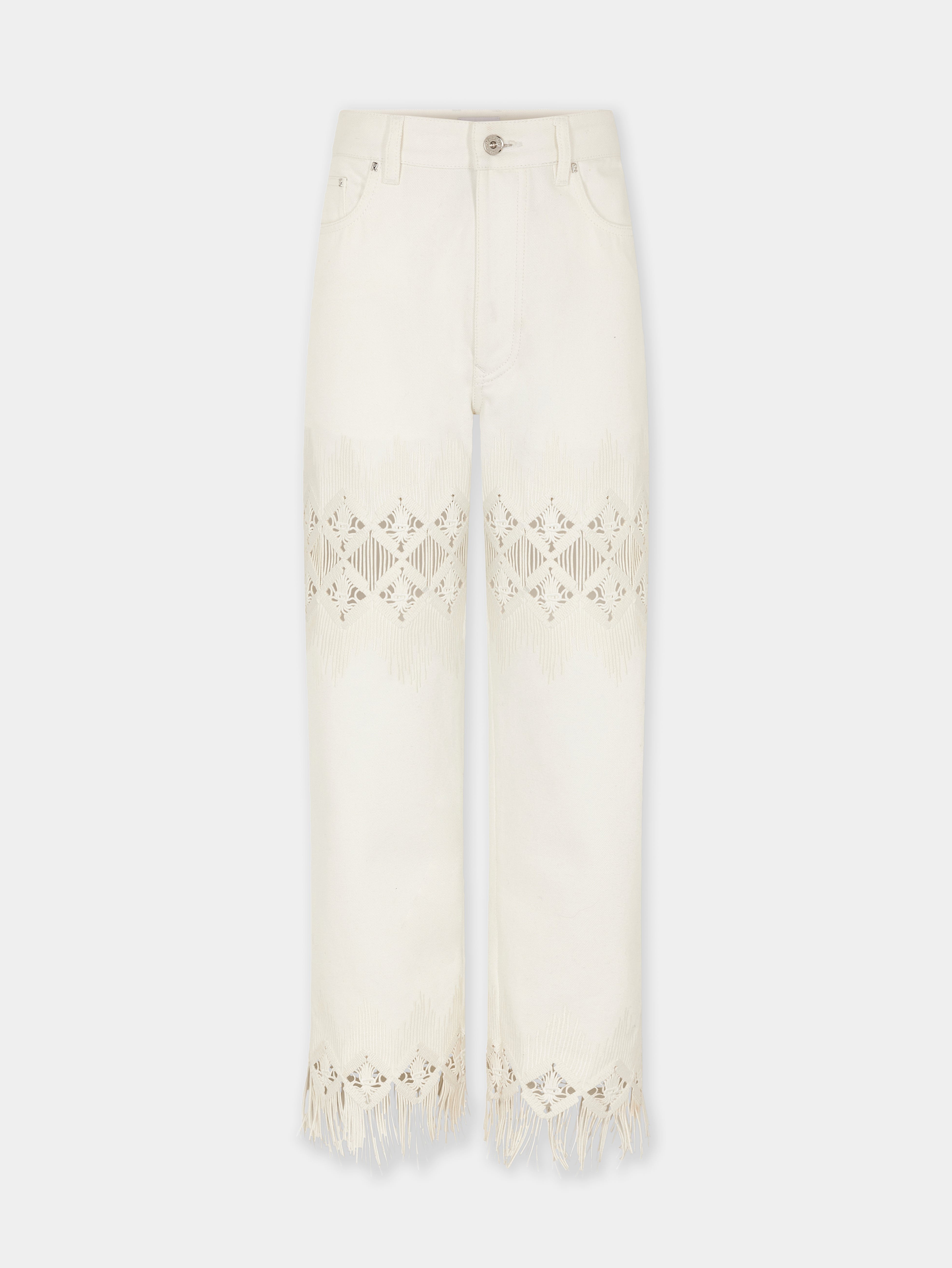 Denim trousers with embroidery details - Color: Off white denim - Geometric embroideries details and fringed edges. - Composition: 100% Cotton - Made in Italy Size & Fit - Model's height: 180 cm / 5ft 11in - Model wears a size FR 36 / UK 8 / US 4 - This style is true-to-size - We recommend your usual size.