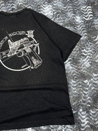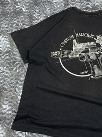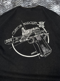 Vintage 90s custom marquet single stitch T-shirt with a gun print. Condition shows faded color. Tagged size L — please check the measurements. Worldwide shipping 1–4 weeks No return/refund More info in dm Shipping from Moldova/Ukraine, not the USA. All customs duties and import taxes are covered by me. Chest 21.65 in 55 cm Length 26.57 in 67.5 cm Shoulders 20.87 in 53 cm Sleeve Length 7.28 in 18.5 cm